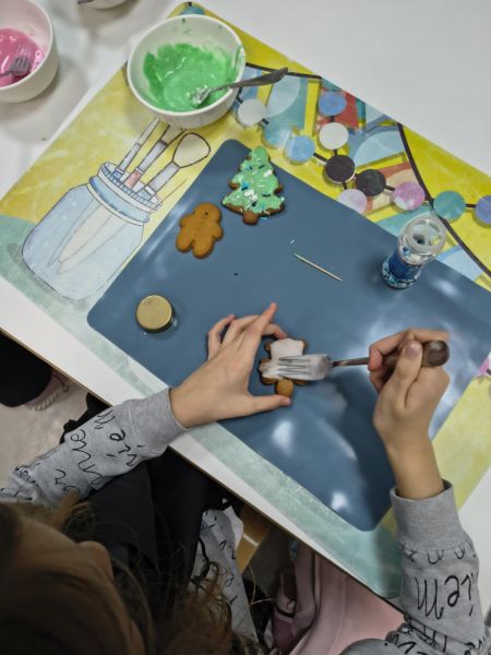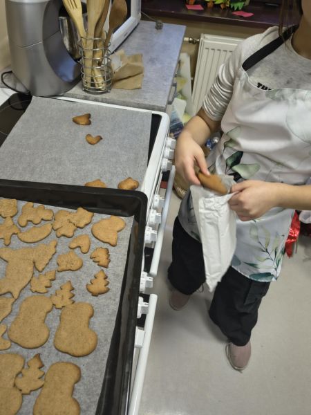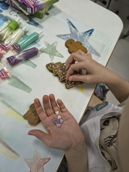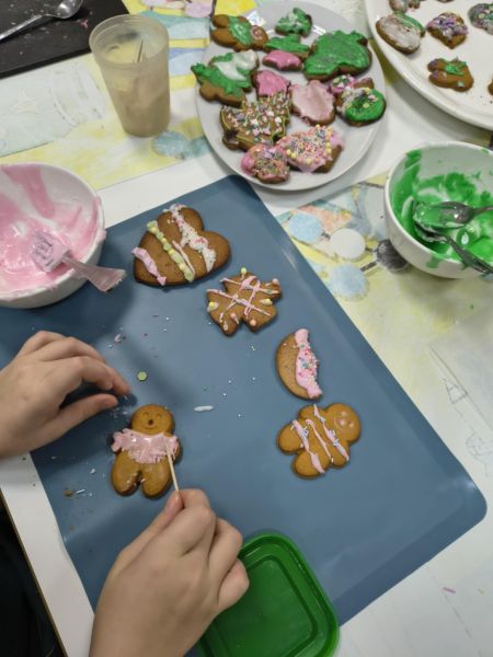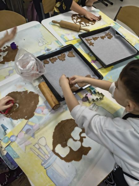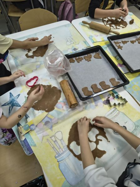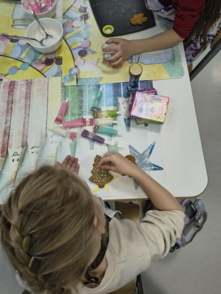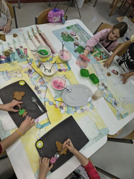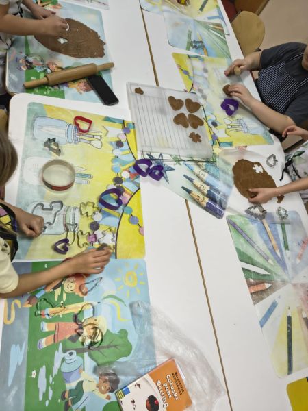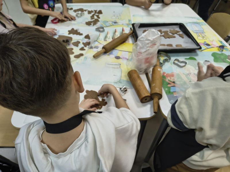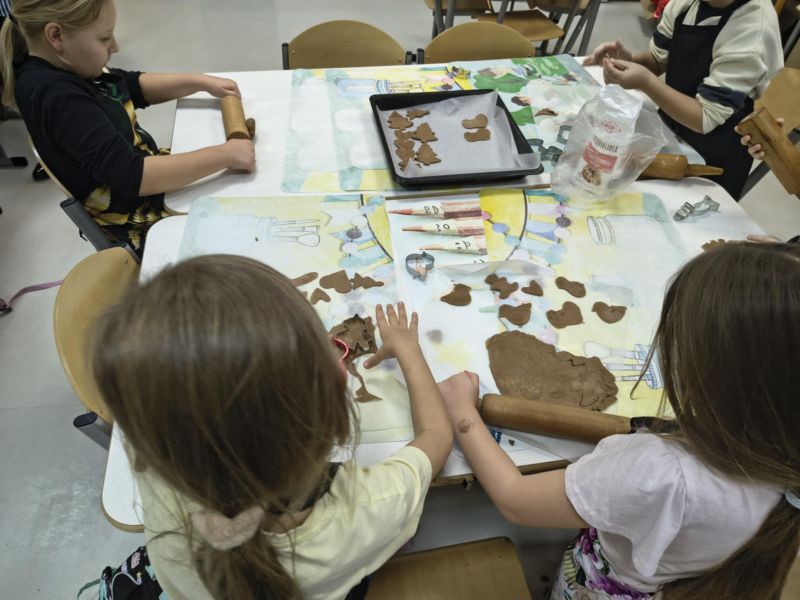 Po lekturze fragmentu zbioru "Całuski Pani Darling" Małgorzaty Musierowicz o piernikach pieczonych w Bullerbyn, uczniowie zabrali się za pieczenie i ozdabianie własnych pierniczków, przy dźwiękach gwiazdkowych utworów. Zajęcia odbyły się gościnnie w Laboratorium Przyszłości.