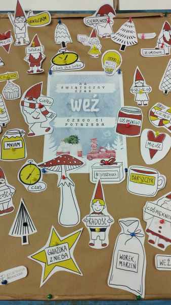 Przed biblioteką czeka na wszystkich specjalna tablica „Weź, czego Ci trzeba na świąteczny czas!”, to nasze zaproszenie do chwili refleksji nad tym, czego naprawdę pragniemy dla siebie i najbliższych, na nadchodzący czas…