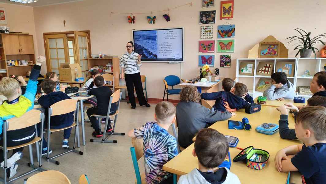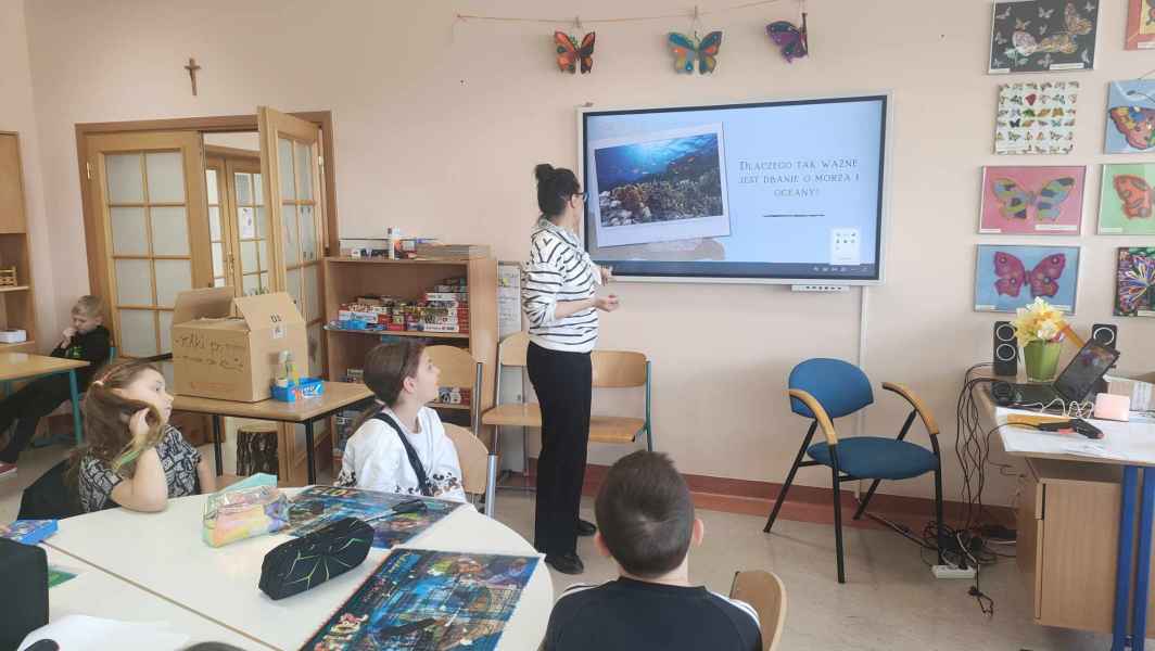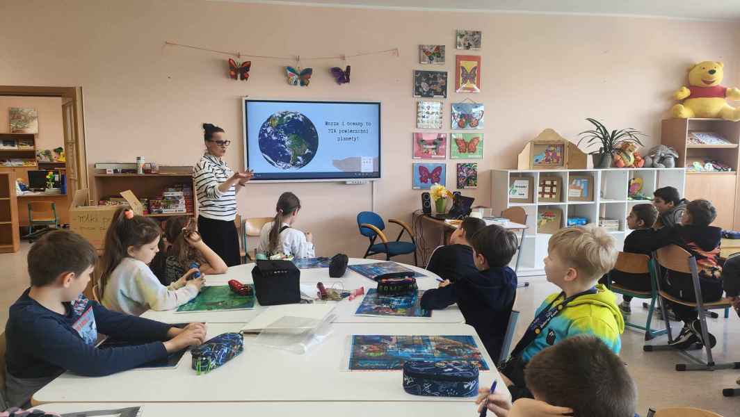 Najpier dzieci dowiedziały się na czym polegają prawa autorskie, po co zostały ustalone? Czy z zasobów internetu można korzystać bez ograniczeń? Czym są otwarte zasoby? Jaki znamy największy otwarty zasób na świecie? Kto go tworzy? Oczywiściemówiliśmy o Wikipedii i jej możliwościach. Następnie, wraz z trzecimi klasami rozmawialiśmy o zasobach wodnych naszej planety. Co to znaczy, że oceany to drugie płuco Ziemi? A co stanowi pierwsze?