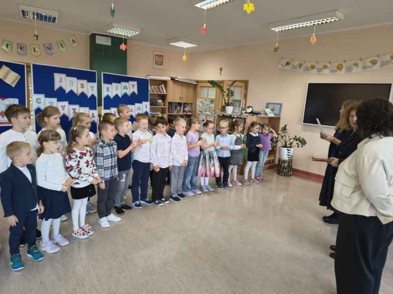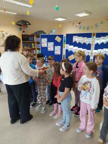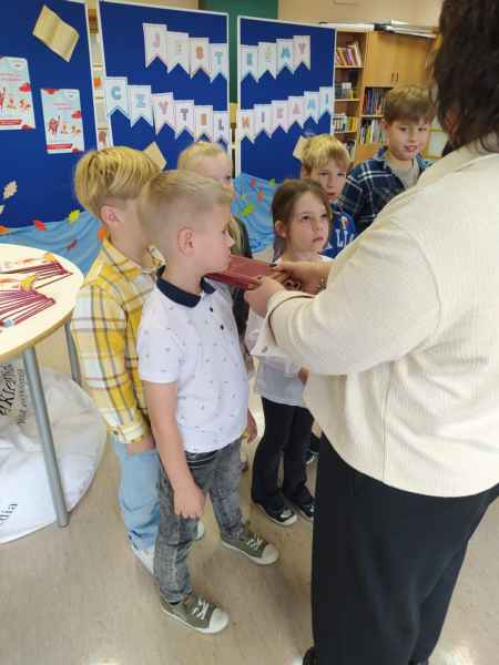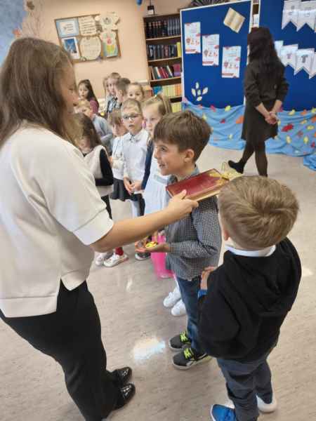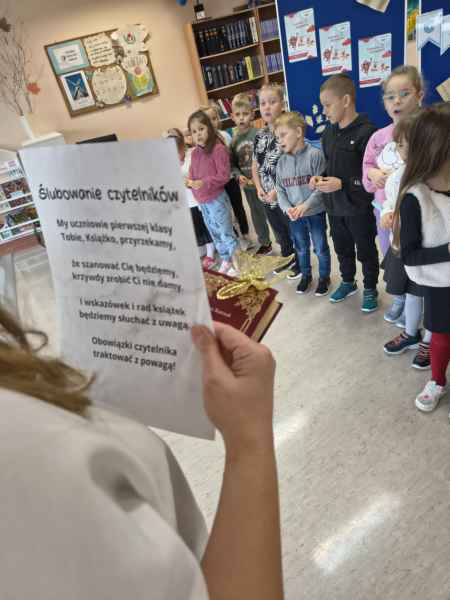 Przypomnieliśmy sobie zasady dobrego zachowania w bibliotece oraz to, jak książki lubią być traktowane, po czym przystąpiliśmy do uroczystego ślubowania. Dziękujemy za uświetnienie pasowania Dyrekcji Szkoły.