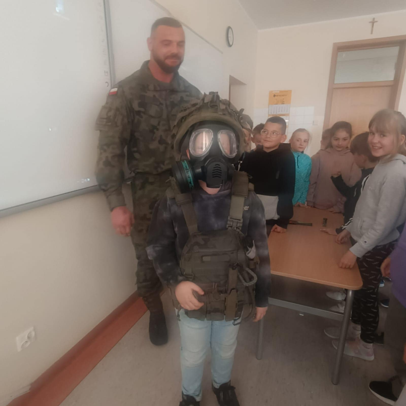 Nasz gość zaprezentował swój mundur oraz pokazał dzieciom wyposażenie żołnierza. Każdy mógł sprawdzić jak ciężki jest plecak i kamizelka żołnierza jadącego na poligon i ile rzeczy musi on mieć przy sobie. Dzieci nauczyły się poprawnie oddawać hołd. Mogły przymierzyć różne wojskowe nakrycia głowy, wypróbować krzesiwa, pooddychać w masce przeciwgazowej, a także spróbować przeczołgać się w kamizelce taktycznej. Co więcej, dzięki uprzejmości naszego gościa uczniom został wykonany profesjonalny kamuflaż.