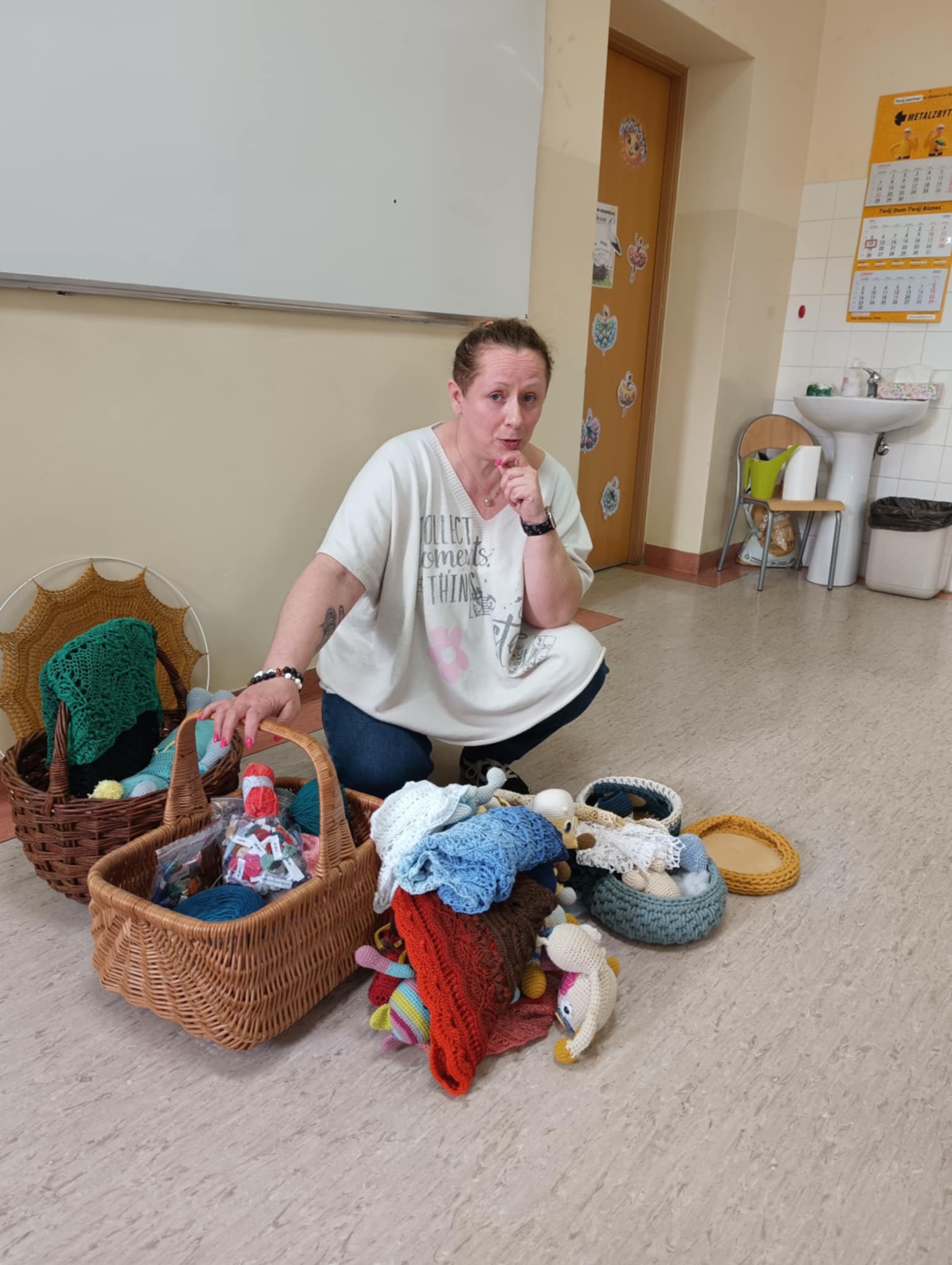 16 maja 2025 roku klasa 3d miała przyjemność uczestniczyć w lekcji, podczas której o swojej pasji opowiadała mama naszej uczennicy. Pani Sylwia podzieliła się wiedzą dotyczącą szydełkowania. Na początku zajęć wprowadziła w temat opowiadając o rodzajach włóczek, szydełek i narzędzi niezbędnych do wykonania prac. Podzieliła się także historią, dlaczego stało się to jej hobby i jakie korzenie sięga szydełkowanie w jej rodzinie. Następnie Pani Sylwia pokazała nam swoje przepiękne prace. Wszyscy byli oczarowani starannością, dbałością o szczegóły i ogromem zaangażowania i serca, jakie wkłada artystka w swoje wyroby. Ponadto, uczniowie mogli poprzytulać się do uroczych misi, przymierzyć ciepłe opaski i czapki, a także przyodziać się w oszałamiające chusty. Na zakończenie Pani Sylwia zaprezentowała jak wygląda najprostszy ścieg, a zgromadzone wokół niej dzieci były pełne podziwu za zręczność i szybkość ruchów dłoni.