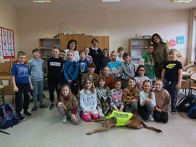 Dnia 24 lutego 2023 r. w ramach doradztwa zawodowego klasy III f oraz V e gościły funkcjonariuszy Straży Granicznej z Gdańska wraz z psem służbowym. Pani Justyna Świerczyńska opowiedziała dzieciom o zadaniach i roli strażników granicznych.