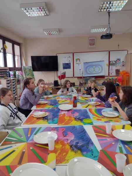 Z okazji Dnia Kobiet chłopcy z klasy 5 E sprawili ogromną niespodziankę swoim koleżankom. Zaprosili je na pizzę, którą sami przygotowali. Wszyscy spotkali się w sali, w której odbywają zajęcia ze sprzętem pozyskanym w ramach programu „Laboratoria Przyszłości”.
