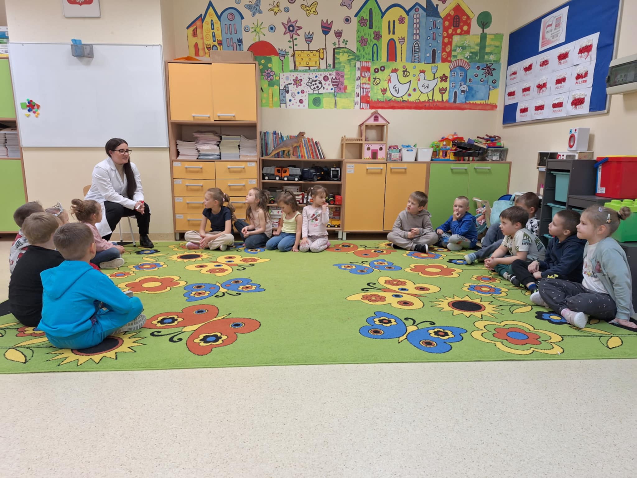 W piątek grupę 0a odwiedziła mama Liliany – pani Joanna, która opowiedziała dzieciom o swoim zawodzie pielęgniarki. Podczas spotkania przedszkolaki miały okazję zobaczyć z bliska, jak wygląda strój pielęgniarki, a także poznać różne urządzenia i akcesoria, których używa ona w swojej codziennej pracy.