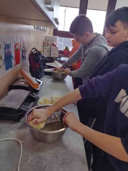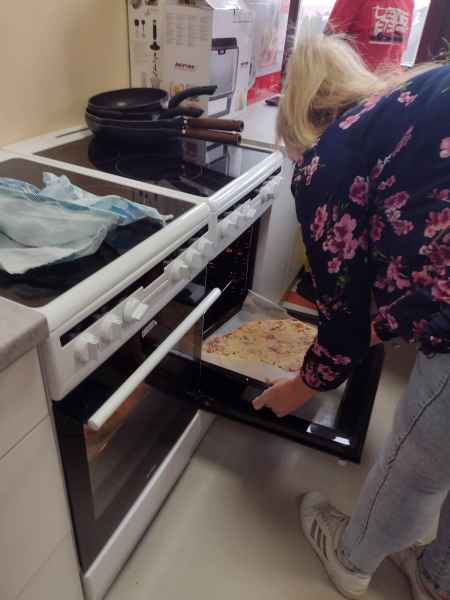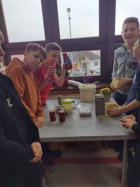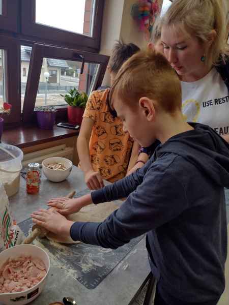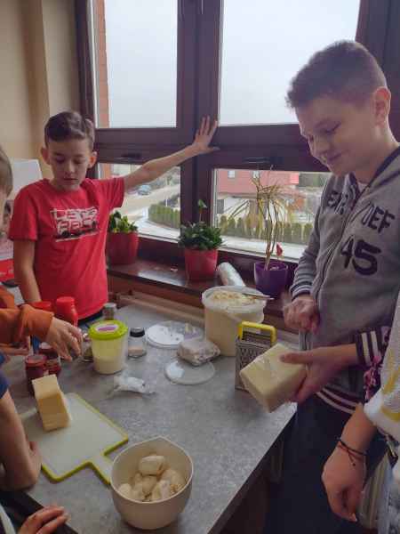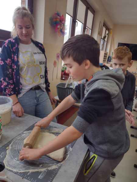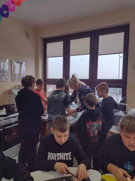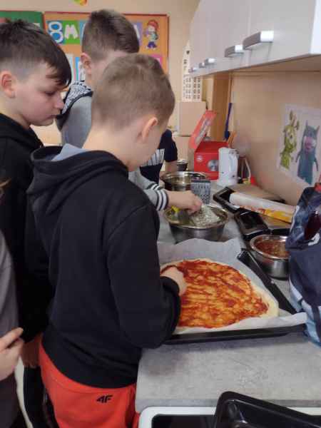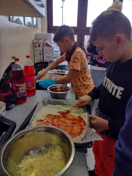 Tam, dzięki pani Iwonie Roda, mamie Sebastiana, obchodziliśmy Klasowy Dzień Kobiet. Wszyscy chłopcy zaangażowali się w działania. Jedni wałkowali ciasto, inni kroili pieczarki i szynkę, jeszcze inni tarli ser, a to wszystko pod czujnym okiem rodzica i wychowawcy. Kucharze z kl. 5 E przygotowali aż cztery blachy pizzy, z których nic nie zostało, bo wszystkim bardzo smakowało, za co serdecznie dziękujemy, a szczególnie pani Roda.