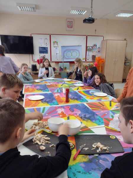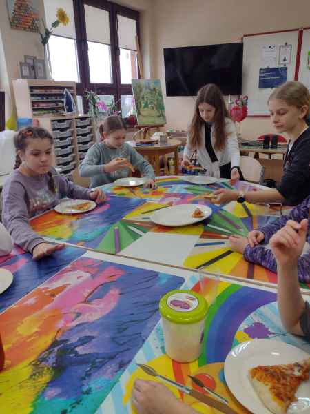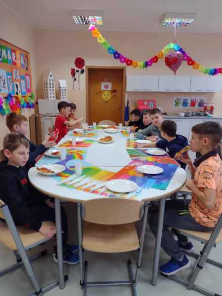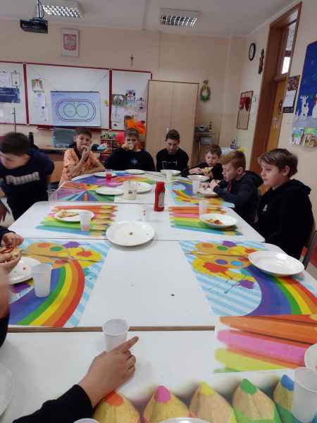 Z okazji Dnia Kobiet chłopcy z klasy 5 E sprawili ogromną niespodziankę swoim koleżankom. Zaprosili je na pizzę, którą sami przygotowali. Wszyscy spotkali się w sali, w której odbywają zajęcia ze sprzętem pozyskanym w ramach programu „Laboratoria Przyszłości”.