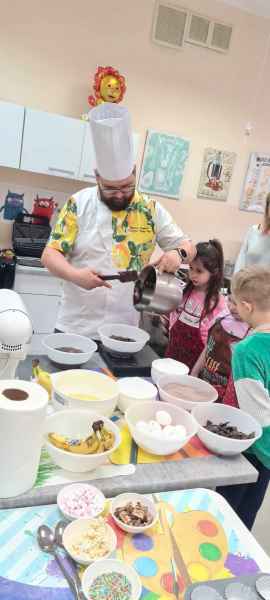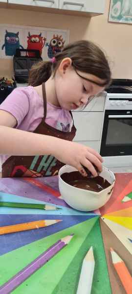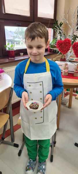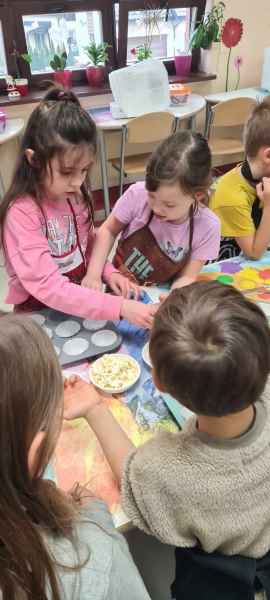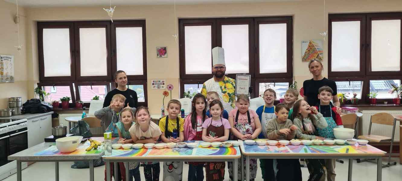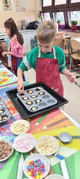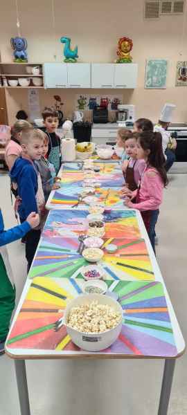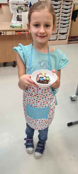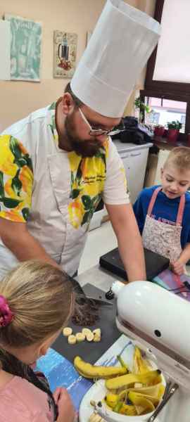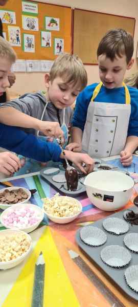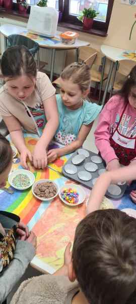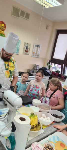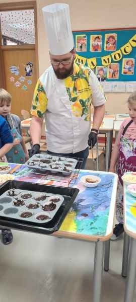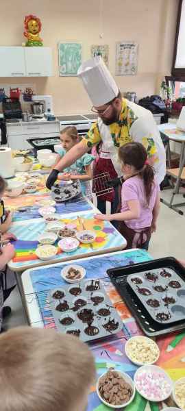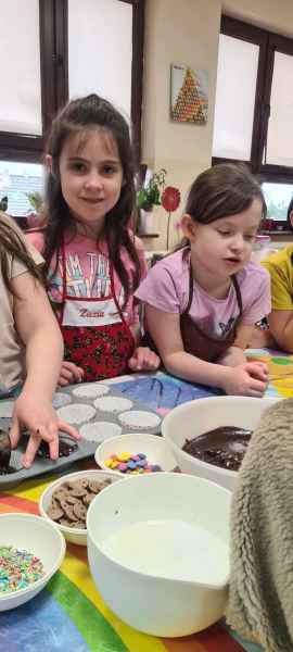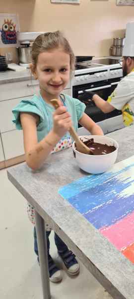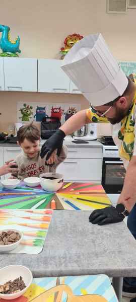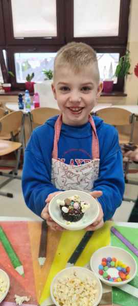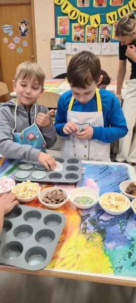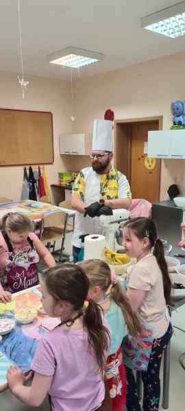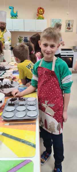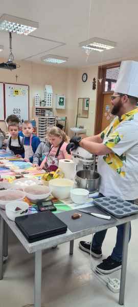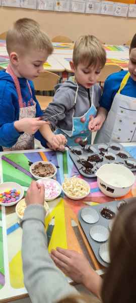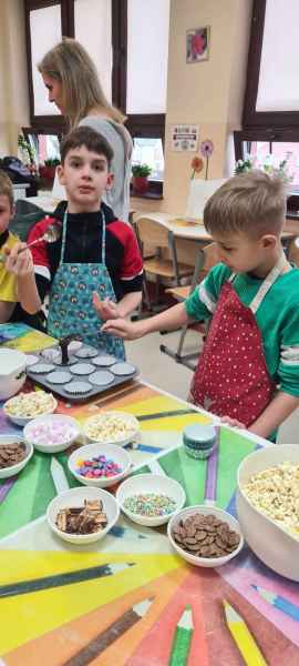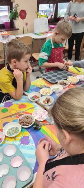 Pan Wojciech specjalizuje się w nowoczesnym cukiernictwie z tradycyjnymi korzeniami i jest to jego największą życiową pasją. Podczas warsztatów dzieci uczyły się, jak zrobić babeczki oraz pięknie je dekorowały, aby na końcu zjeść je ze smakiem! Bawiąc się w piekarzy, dzieci poznały tajniki zawodu cukiernika. Choć praca wydaje się bardzo słodka i przyjemna, wymaga dużej wyobraźni, doświadczenia i umiejętności. Także dużo siły. Podczas warsztatów uśmiech i dobra zabawa towarzyszyła wszystkim!