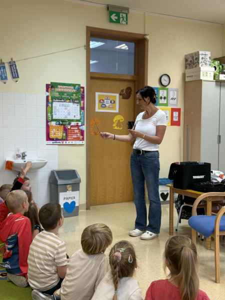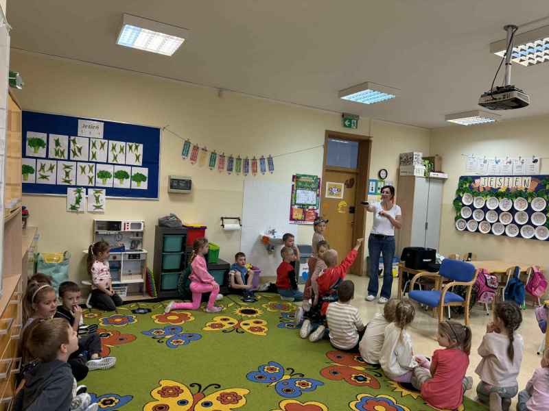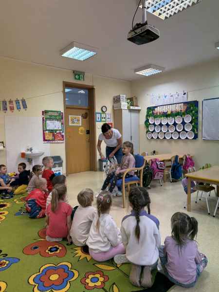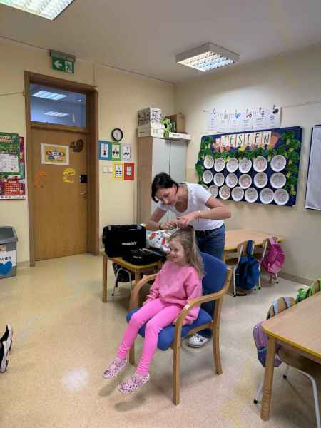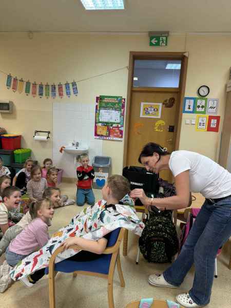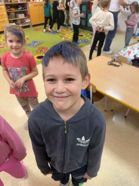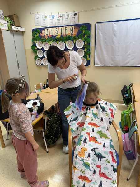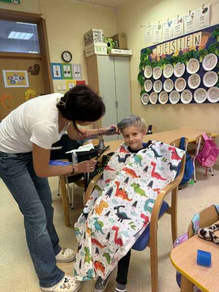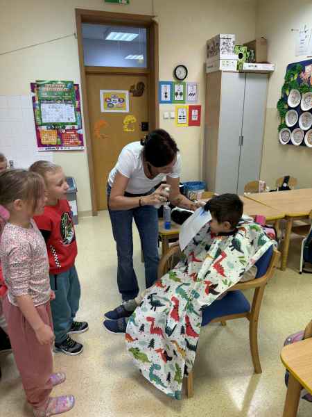 Dziś naszą grupę odwiedziła mama Liliany, Pani Anna, która wykonuje zawód fryzjera. Opowiedziała dzieciom o swojej codziennej pracy, pokazała różne sprzęty i akcesoria potrzebne w salonie fryzjerskim. Dzieci z zaciekawieniem słuchały, jak wygląda tworzenie fryzur i jak należy dbać o włosy. Nie zabrakło też praktycznej części zajęć – chętne dzieci mogły ozdobić swoje włosy kolorowymi sprayami! Było przy tym mnóstwo radości i śmiechu. Na zakończenie pani fryzjerka przygotowała krótki quiz wiedzy o zawodzie, w którym dzieci doskonale poradziły sobie z odpowiedziami. Dziękujemy Pani Annie za ciekawe spotkanie, inspirującą rozmowę i wprowadzenie nas w tajniki pracy fryzjera!
