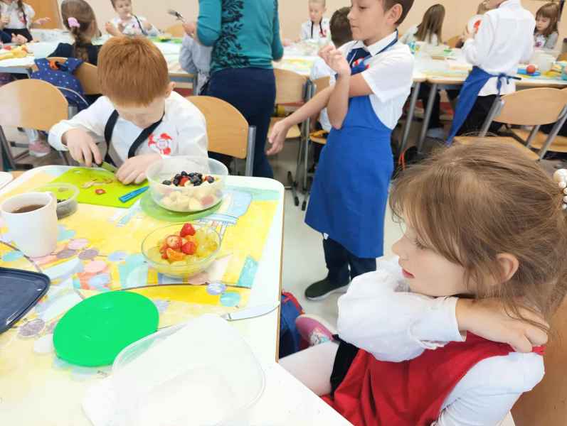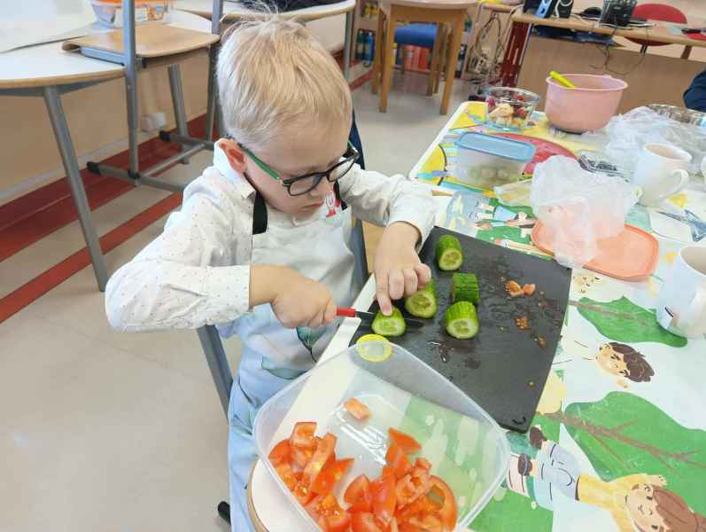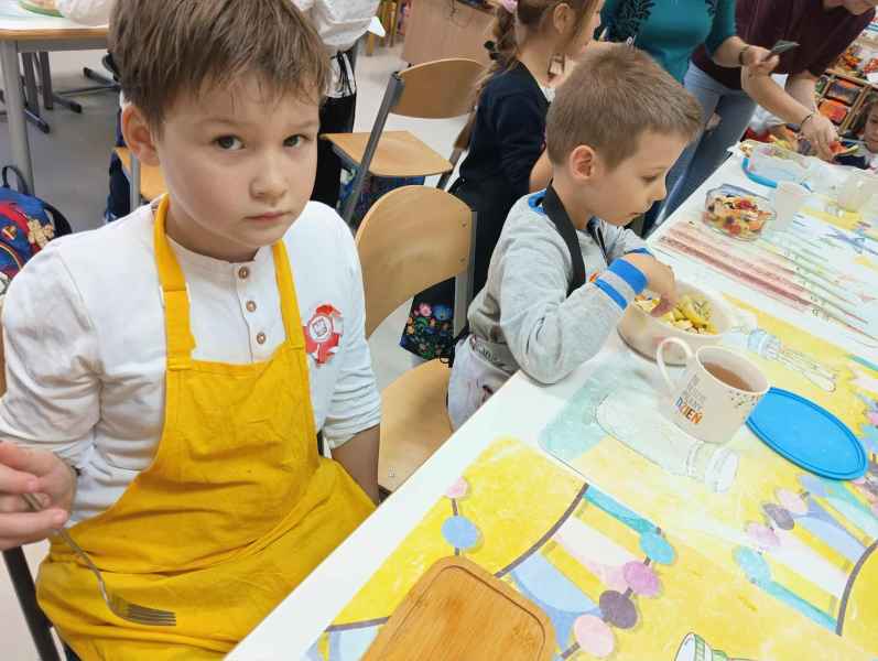 W ramach realizacji projektu edukacyjnego „Planeta Zdrowia” uczniowie klasy 1a uczestniczyli w wyjątkowych zajęciach kulinarnych. Dzięki zaangażowaniu i ogromnej pomocy naszych mam, pani Anny oraz pani Marty, dzieci samodzielnie przygotowały w szkolnym Laboratorium Przyszłości pyszne sałatki owocowe i warzywne.