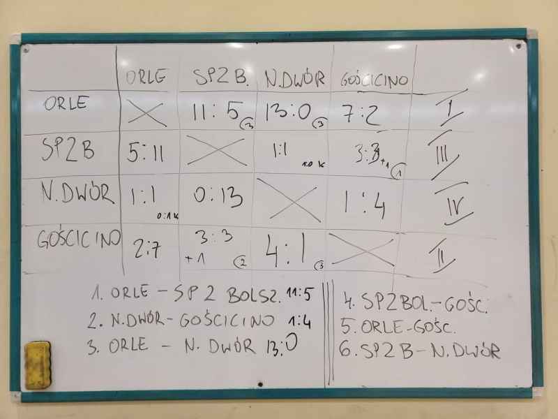 Graliśmy systemem "każdy z każdym". Nasze dziewczyny po cieżkiej walce zajęły trzecie miejsce. Warto dodać, że 13 z 15 dziewcząt to uczennice klasy piątej, więc mieliśmy bardzo młody zespół.