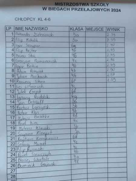 Dziś na szkolnym boisku odbyły się zawody w biegach przełajowych. Były to eliminacje do gminnych sztafetowych biegów przełajowych, które odbędą się za tydzień na terenie naszej szkoły. Uczniów, do udziału w zawodach zapisywali nauczyciele uczący w danej klasie.