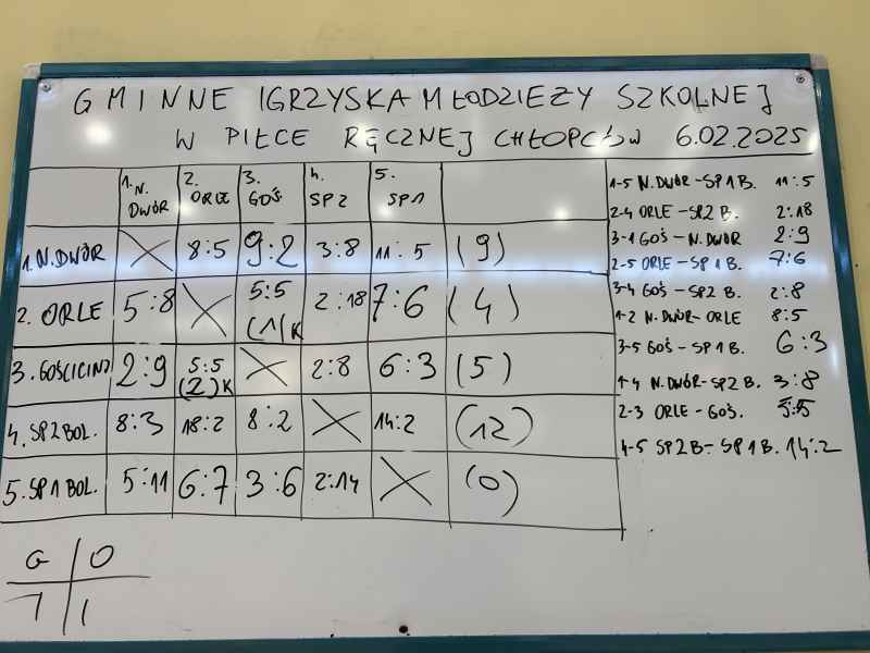 Dnia 6.02.2025 r. w naszej hali sportowej odbyły się Gminne Igrzyska Młodziezy Szkolnej w Piłce Ręcznej Chłopców. Do rywalizacji stanęło 5 zespołów. SP 1 Bolszewo, SP Nowy Dwór, SP Orle, SP Gościcino, SP 2 Bolszewo.