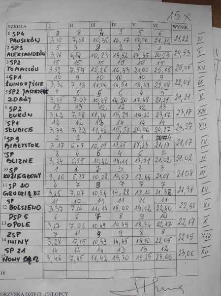 ( w Polsce w tym roku jest 9112 szkół podstawowych, które też brały udział w eliminacjach, a którym nie udało się awansować do finału). Gratulujemy, dziękujemy za walkę i włożony wysiłek. Trasa była mordercza, konkurencja bardzo mocna , ale nasi chłopcy dali z siebie wszystko, dosłownie padali na mecie. Sukces ten nie byłby możliwy, gdybyśmy nie dostali wsparcia finansowego. Wyjazd na ten Finał Krajowy ( 12 godzin jazdy plus nocleg z wyżywieniem) zawdzięczamy wójtowi Gminy Wejherowo Przemysławowi Kiedrowskiemu , dyrekcji szkoły oraz Agencji Ochrony "Ajax". Skład drużyny : Jan Cilińdź 6a, Nikodem Miotk 6a, Paweł Rokosz 6a, Maciej Miszka 5e , Borys Woźnicki 5e, Leon Stolc 6f, i rezerwa : Olivier Zawadzki 6f,Piotr Kwidziński i Igor Szczypior 4g oraz Wiktor Dynia 6a.
