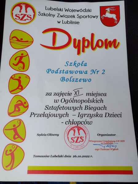 W Finale Krajowym w Sztafetowych Biegach Przełajowych, który odbył się 26.10.2022r. w Tomaszowie Lubelskim, NASI CHŁOPCY z SP 2 BOLSZEWO , kategoria rocznik 2010 i młodsi, zajęli 11 -ste miejsce