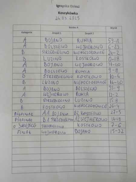 24 marca w Szkole Podstawowej nr 8 w Wejherowie odbyły się POWIATOWE IGRZYSKA DZIECI w piłce koszykowej. Na zawody przyjechało osiem drużyn, które zostały podzielone na dwie grupy. Nasze dziewczęta zagrały w grupie z zawodniczkami z Wejherowa, Bojana i Rumi. Wygrały mecz z uczennicami ze Szkoły Podstawowej z Rumi i odpadły z rozgrywek zajmując V miejsce.