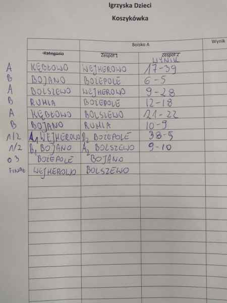 25 marca w Szkole Podstawowej nr 8 w Wejherowie odbyły się POWIATOWE IGRZYSKA DZIECI w piłce koszykowej. Na zawody przyjechało sześć drużyn, które zostały podzielone na dwie grupy. Nasi chłopcy trafili do najsilniejszej grupy. Zagrali z zawodnikami gospodarzy i z uczniami z SP Kębłowo. Przegrali z Wejherowem i wygrali z Kębłowem. Następnie grali krzyże z SP Bojano, wygrali i awansowali do finału,
