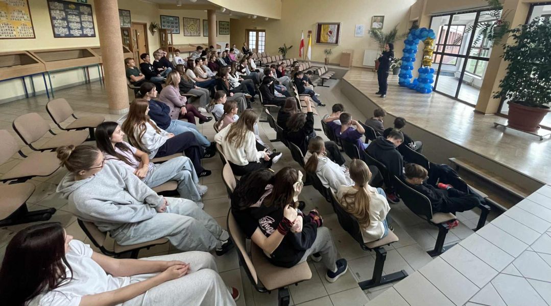 Podczas prelekcji poruszono tematy związane m.in. z: odpowiedzialnością nieletnich za czyny karalne oraz demoralizację, konsekwencjami prawnymi stosowania przemocy, posiadania substancji zakazanych i niszczenia mienia, zasadami bezpiecznego korzystania z Internetu i mediów społecznościowych, reagowaniem na sytuacje zagrożenia oraz możliwościami uzyskania pomocy, kształtowaniem postaw odpowiedzialności, szacunku i troski o bezpieczeństwo własne i innych. Uczniowie aktywnie uczestniczyli w spotkaniu, zadając pytania i dzieląc się własnymi doświadczeniami. Prelekcja została przyjęta z dużym zainteresowaniem, a treści przekazane przez funkcjonariusza znacząco wpłynęły na poszerzenie wiedzy młodzieży dotyczącej konsekwencji podejmowanych działań. Tego typu inicjatywy wspierają proces wychowawczy i pomagają młodym ludziom w podejmowaniu świadomych, bezpiecznych i odpowiedzialnych decyzji.