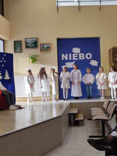 W jasełkach oprócz głównych bohaterów – najmniejszego anioła, Maryi, Józefa i Jezusa, którzy znaleźli schronienie w stajence - pojawili się pasterze, trzej królowie , gospodarze, służki oraz groźny i zawzięty Herod. Z drugiej strony sceny stał anielski chór. Dzięki niemu występy przeplatane były kolędami i pastorałkami. Do tego efektowne stroje. Widzowie poczuli świąteczny klimat. Po przedstawieniu uczniowie z klasy 3 f udali się do swojej sali na słodki poczęstunek przygotowany przez rodziców.