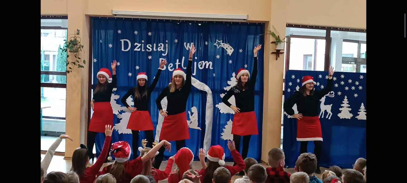 Na zakończenie wszystkich spotkała miła niespodzianka: taniec świąteczny w wykonaniu kilku Pań nauczycielek klas młodszych, do którego zaprosiły także całą zgromadzoną w auli publiczność. Ten niespodziewany dodatek sprawił ogromną radość dzieciom, które z ochotą i entuzjazmem włączyły się do tańca.