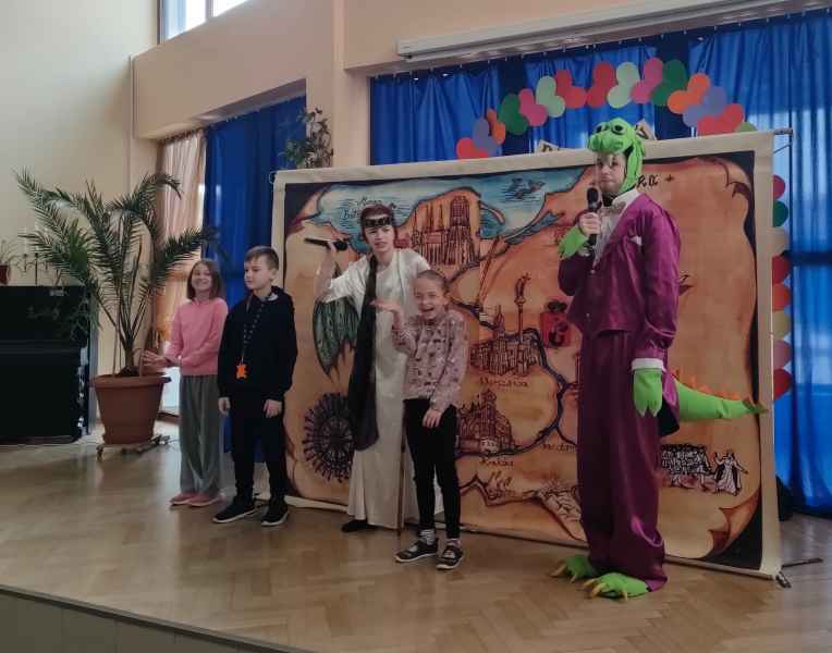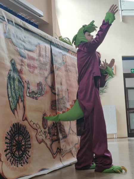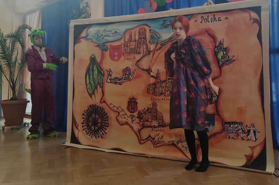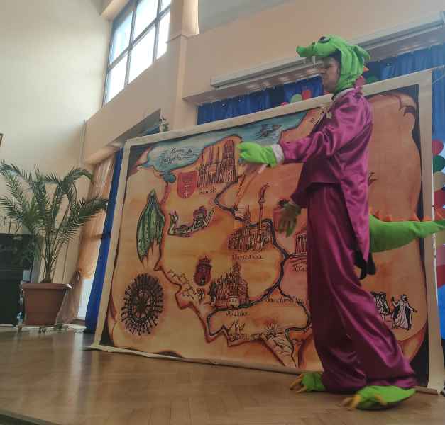 Na deskach szkolnej sceny wystąpił sympatyczny smok wawelski, który odbył podróż z Krakowa do Gdańska. Na swojej drodze spotkał postaci z różnych legend, dzięki którym dzieci zostały zapoznane z historią i charakterem ważniejszych miast, leżących nad najdłuższą rzeką w Polsce.