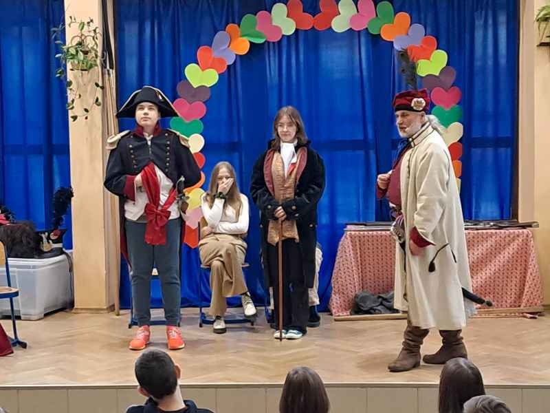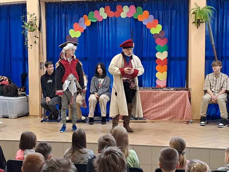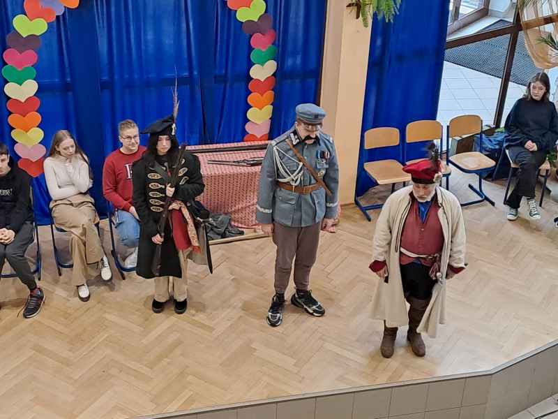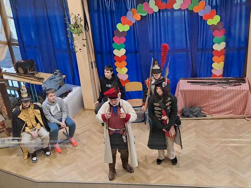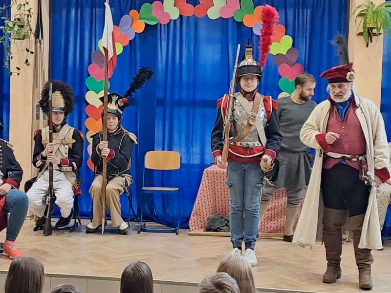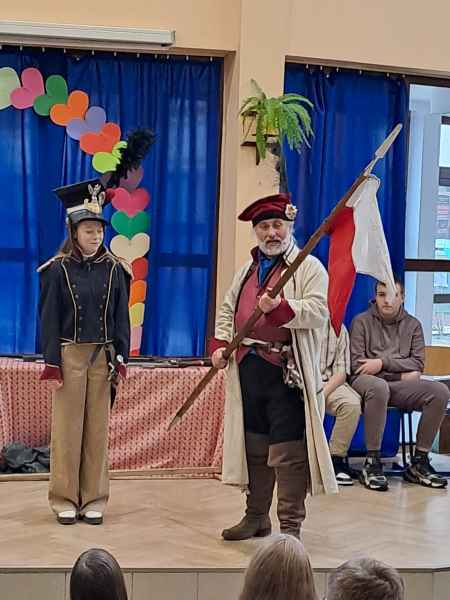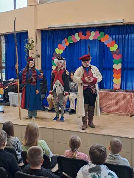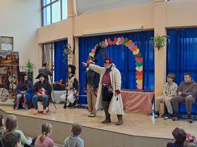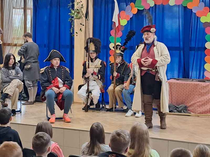 Na scenie szkolnej auli uczniowieklas IV – V dobrze bawili się podczas zajęć pt. „Rodowód rycerstwa”, a kl. VI – VIII na lekcji zatytułowanej „Długi wiek XIX – ku Niepodległej”. Dzieciom podobały się kolczugi, zbroje, miecze i kusze oraz zadania, które wykonywali wybrani z widowni uczniowie. Pan Górecki zaprezentował bohaterów zrywów narodowowyzwoleńczych, którymi na chwilę zostali uczniowie i uczennice klas VII i VIII. Bogate stroje i uzbrojenie ułatwiły młodzieży określić podobieństwa i różnice między powstaniami 1830 i 1863 roku. Uczniowie przypomnieli sobie sylwetki postaci historycznych, z którymi podróżowaliśmy w czasie. Na scenie pojawili się m.in. Tadeusz Kościuszko, WojciechBartos Głowacki, JózefWybicki, Napoleon Bonaparte, Piotr Wysocki czy Józef Piłsudski. Naszej młodzieży nie są obce również elementy uzbrojenia i strojów żołnierzy z XIX wieku. Bez problemu uczniowie wyjaśniają pojęcia: kosynier, rogatywka, grenadier, bermyca, ułan, lanca czy kirys.