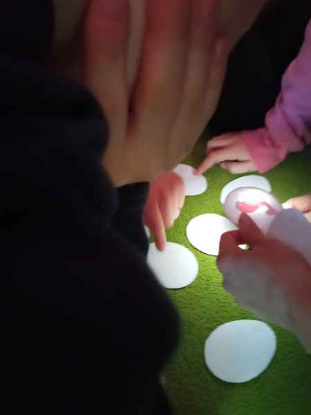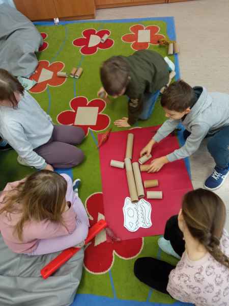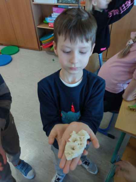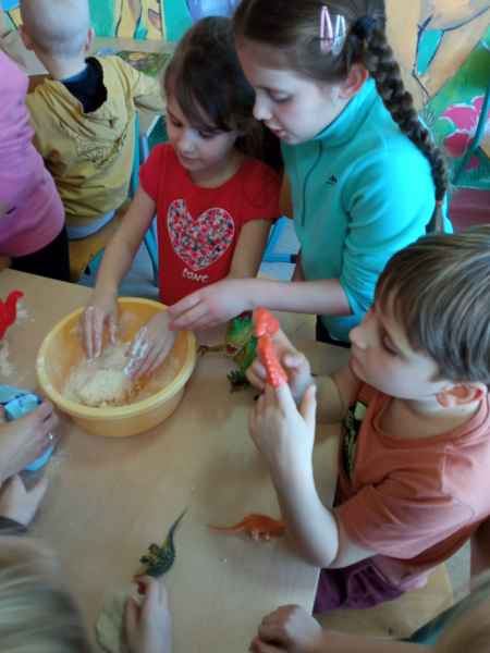 korzystając z atlasów poznawali nazwy dinozaurów ; ćwiczyli umiejętność liczenia poprzez grupowanie różnych gatunków dinozaurów; uczyli się budowy triceratopsa wykopując i składając jego szkielet; projektowali własne gady decydując o ich umaszczeniu przy pomocy markerów; trenowali pamięć odkrywając, co znajduje się w jajach pradawnych zwierząt; tworzyli własne skamieliny używając masy solnej i figurek dinozaurów. Naszych "młodych naukowców" podczas badań możecie zobaczyć na zdjęciach poniżej.