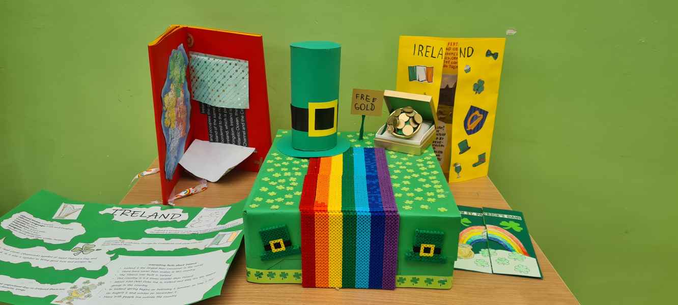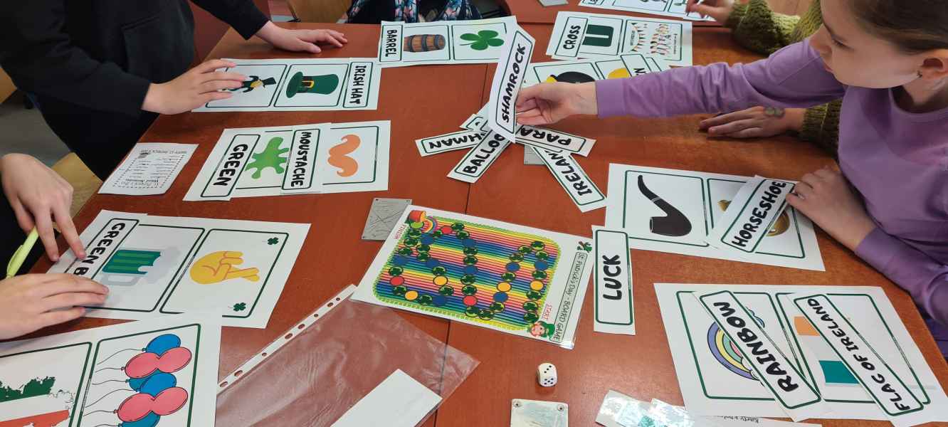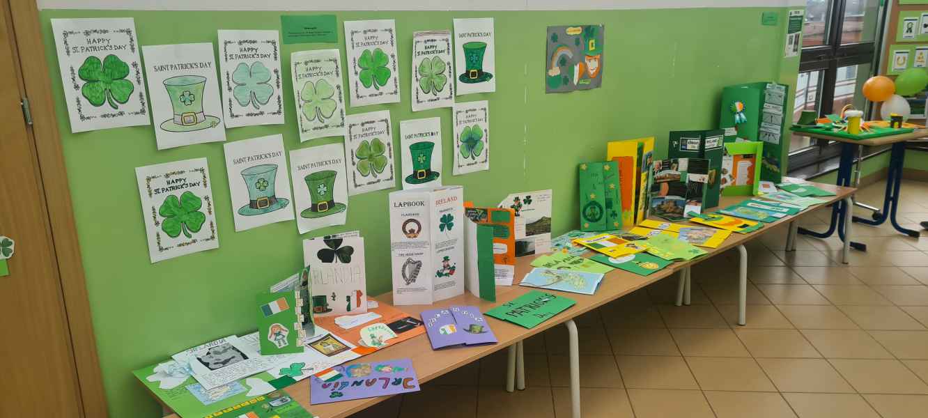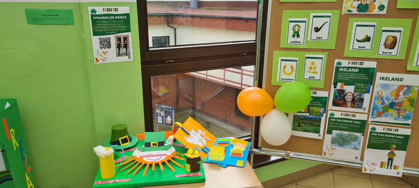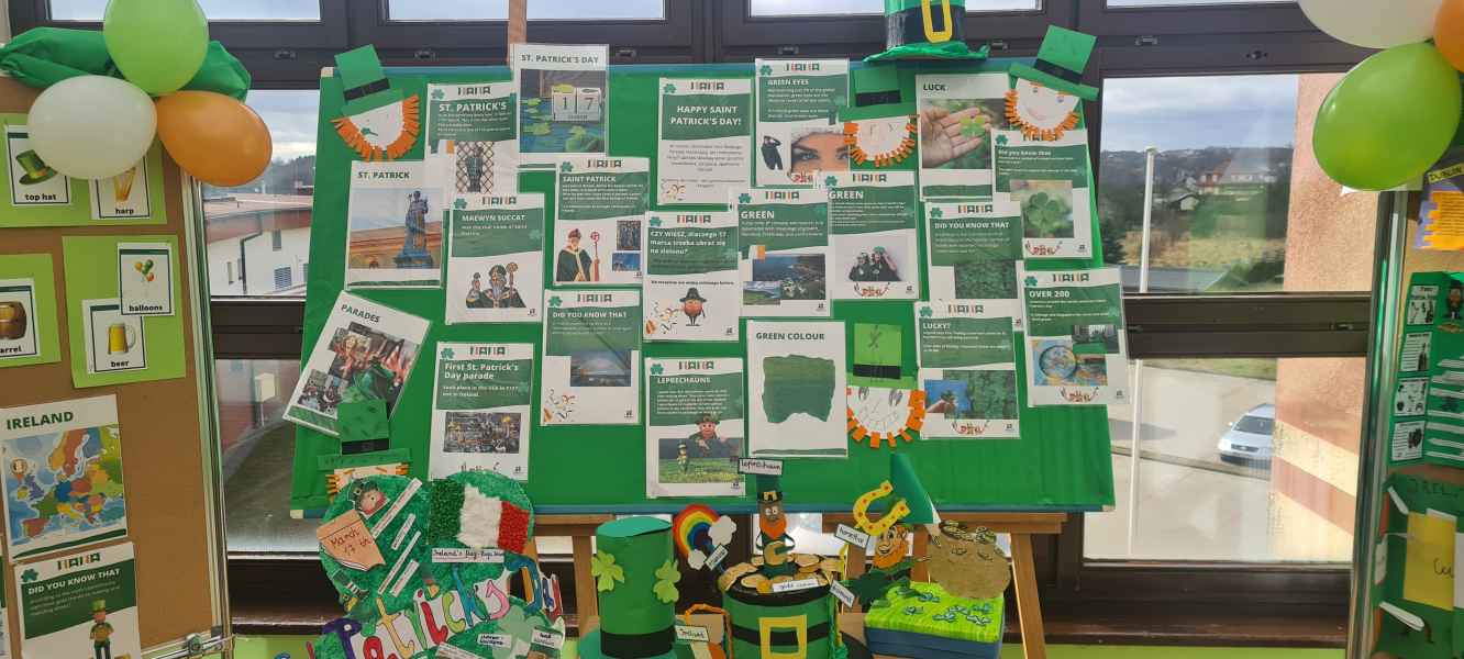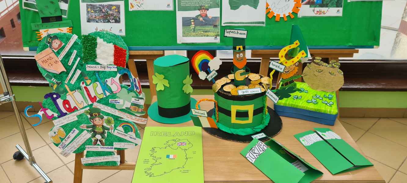 Oprócz informacji o Świętym Patryku i jego niezwykłym życiu, uczniowie odczytując kody QR dowiedzieli się o tradycjach i zwyczajach związanych z Irlandią. Dzieci z klas I-III wykonały piękne prace plastyczne przedstawiające symbole irlandzki, a uczniowie starszych klas stworzyli My Irishlapbook. Prace zostały zaprezentowane na wystawie na korytarzu szkolnym. Nie zabrakło zielonych strojów, dekoracji nawiązujących do legendy o irlandzkim skrzacie Leprikonie oraz do kultury irlandzkiej.