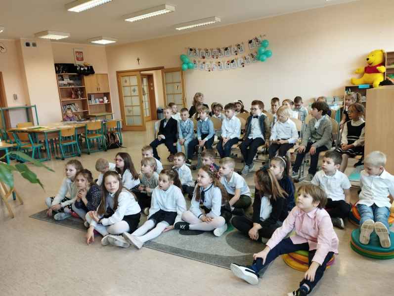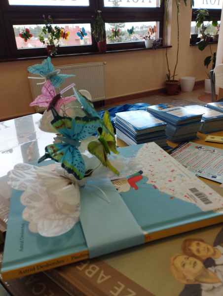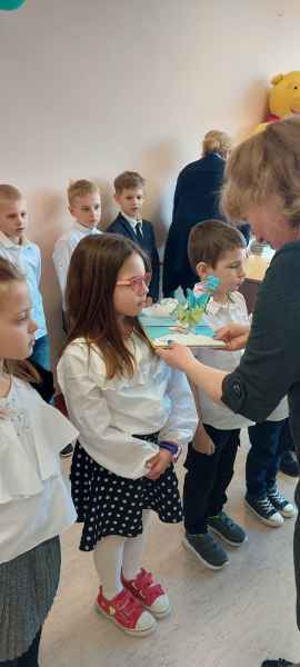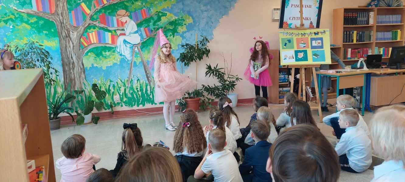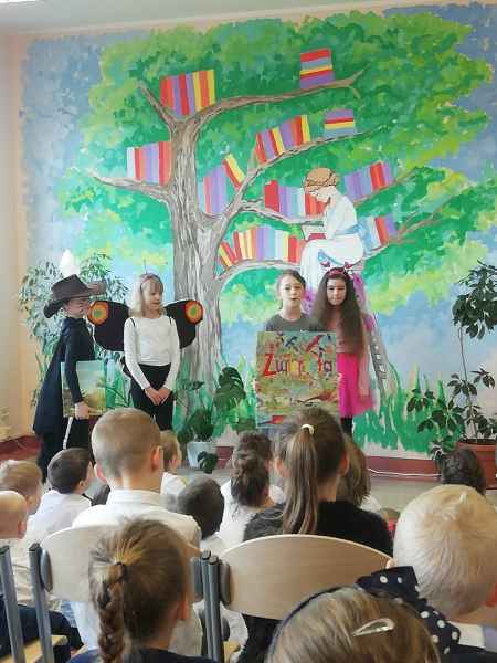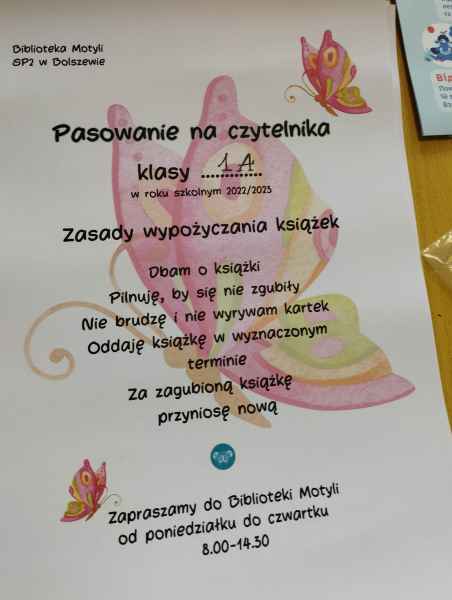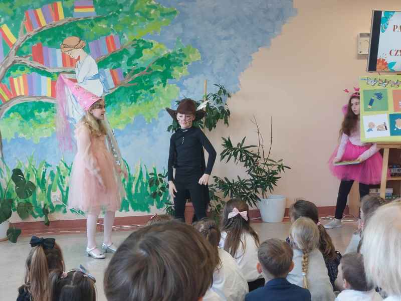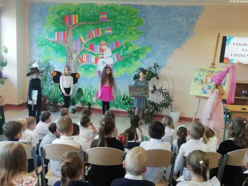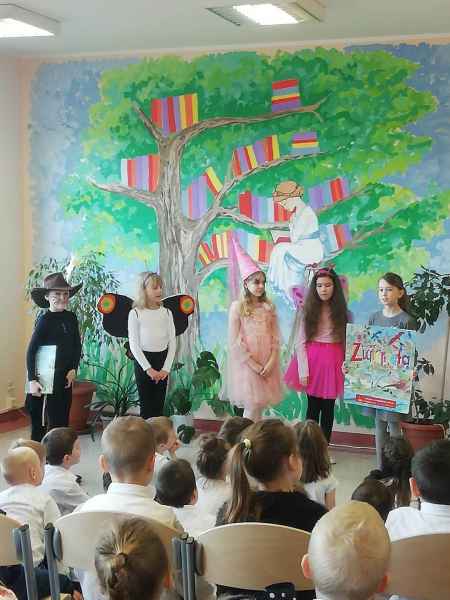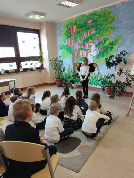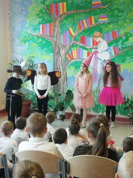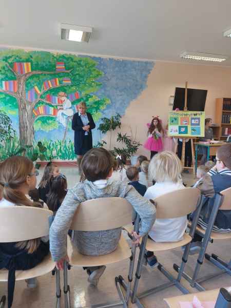 Dzieci przypomniały sobie zasady obchodzenia się z książkami oraz regulamin biblioteki szkolnej, następnie obejrzały spektakl teatralny w wykonaniu ich starszych koleżanek i kolegi z klasy 3F "Prośby Książki". Pierwszaki złożyły uroczyste ślubowanie i zostały pasowane przez Panią Dyrektor naszą magiczną, motylową książką