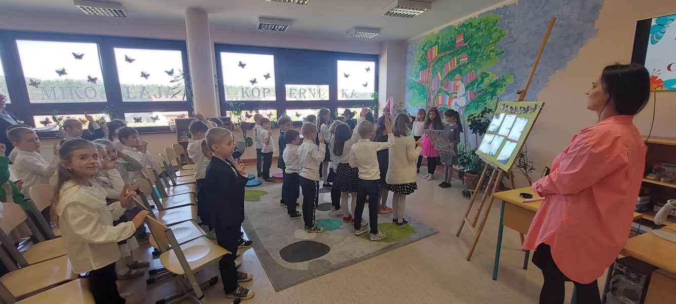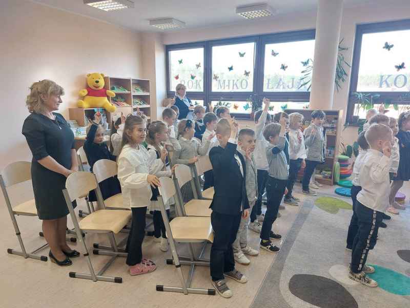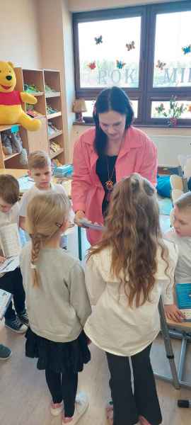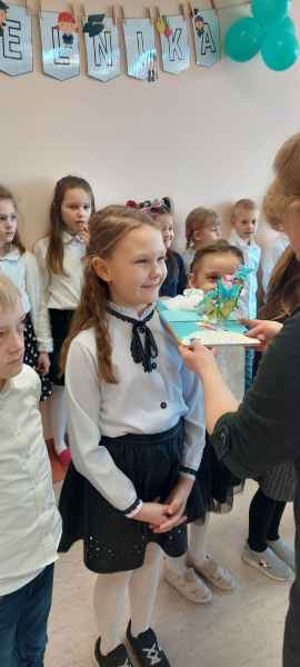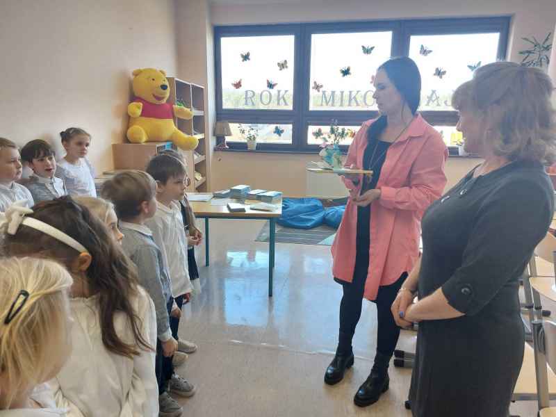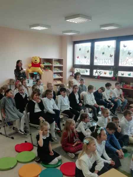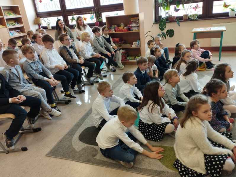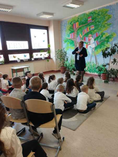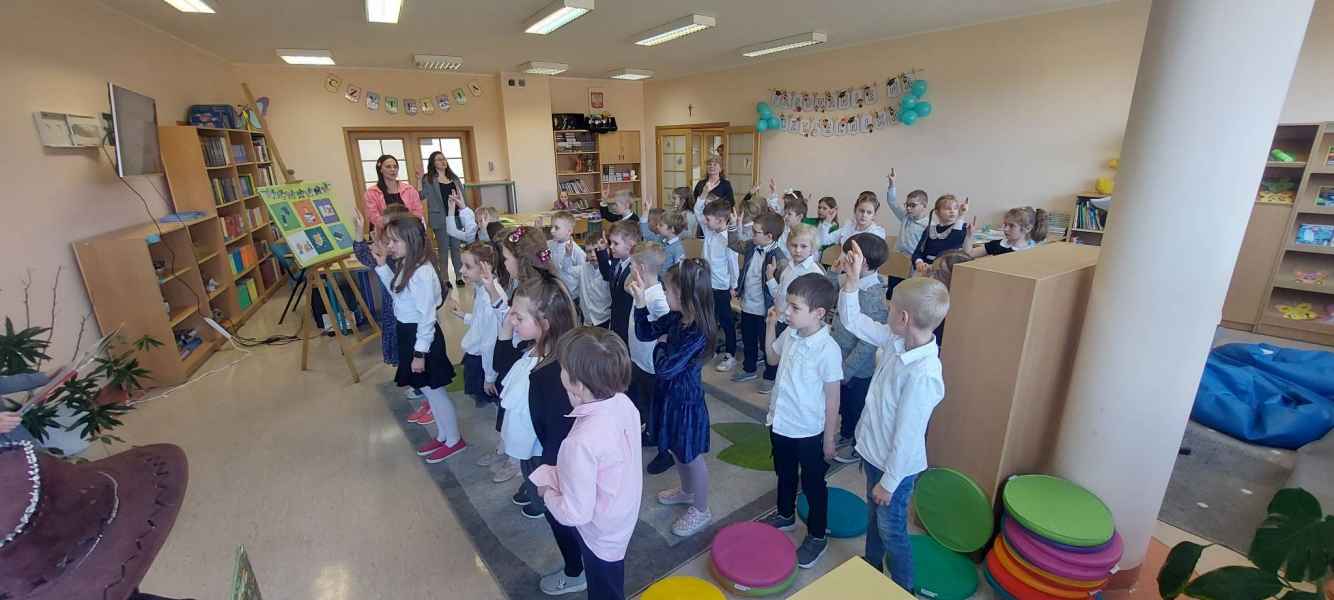Dzieci przypomniały sobie zasady obchodzenia się z książkami oraz regulamin biblioteki szkolnej, następnie obejrzały spektakl teatralny w wykonaniu ich starszych koleżanek i kolegi z klasy 3F "Prośby Książki". Pierwszaki złożyły uroczyste ślubowanie i zostały pasowane przez Panią Dyrektor naszą magiczną, motylową książką