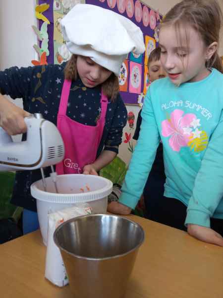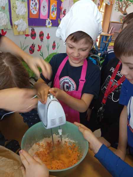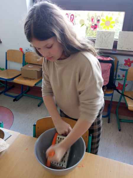 Czy wiecie, że pierwsze karotki były...białe?! Potraficie wymienić wszystkie witaminy i minerały, których dostarcza nam to warzywo korzeniowe? Jakie potrawy z marchwi można przygotować? Odpowiedzi na te i inne pytania dzieci uzyskały nie tylko w trakcie oglądania prezentacji, ale przede wszystkim w praktyce. Smak, kolor, konsystencję, zapach... uczniowie ocenili sami obierając i wyciskając sok, a także przygotowując ciasto marchewkowe! Radosne twarze dzieci oraz okrzyki: "pychota", "najlepsze ciasto jakie jadłam" świadczą o tym, że marchewka jest przepyszna. Oto kilka chwil uwiecznionych na zdjęciach z kulinarnych zajęć w świetlicy.