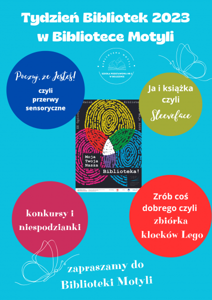 Zakończył się już Tydzień Bibliotek 2023 organizowany jak co roku przez Stowarzyszenie Bibliotekarzy Polskich. Biblioteka Motyli włączając się w ogólnopolską akcję także zorganizowała atrakcje dla swoich czytelników. Odpowiadając na wciąż rosnącą potrzebę spokoju i wyciszenia, przez tydzień w czytelni, uczniowie mogli spędzać czas odpoczywając od zgiełku szkolnych korytarzy.