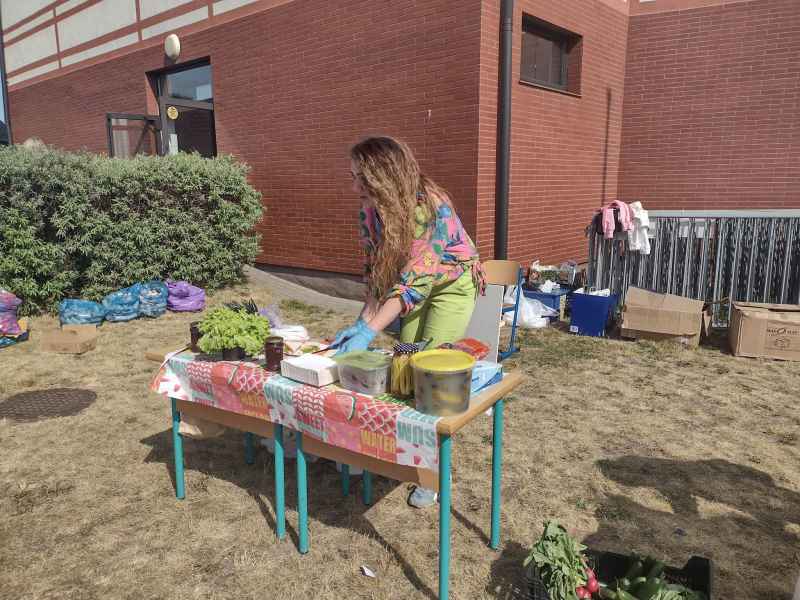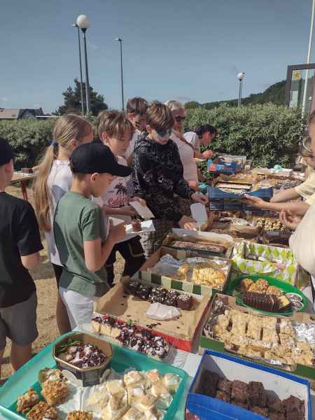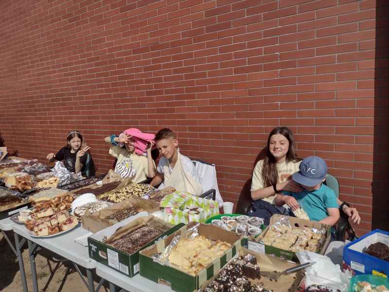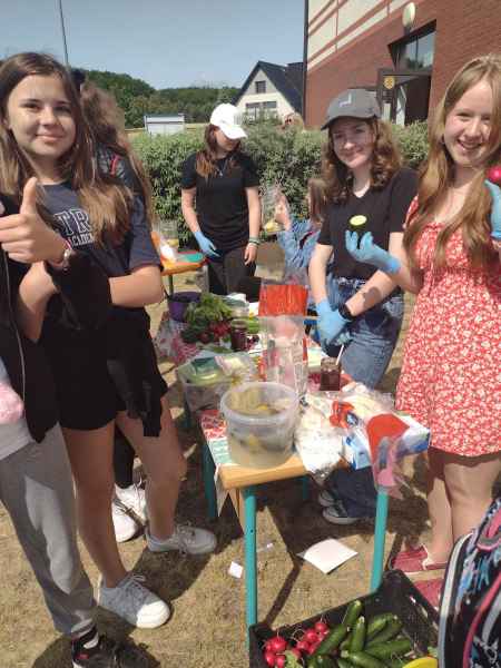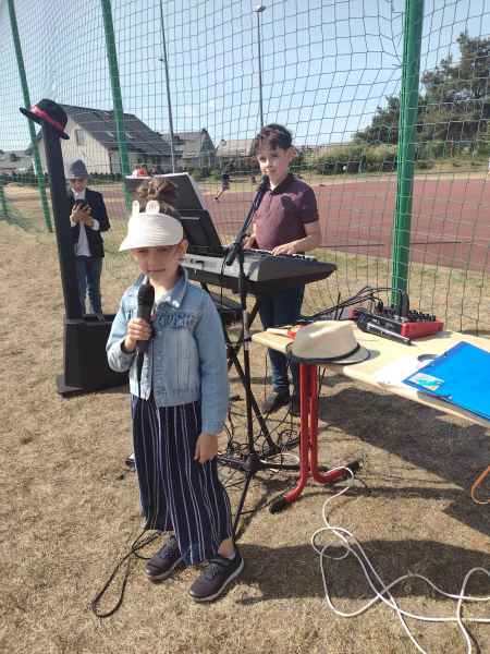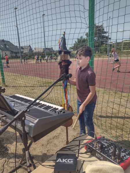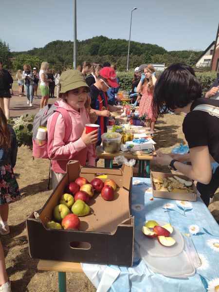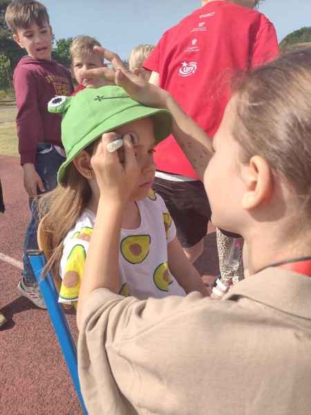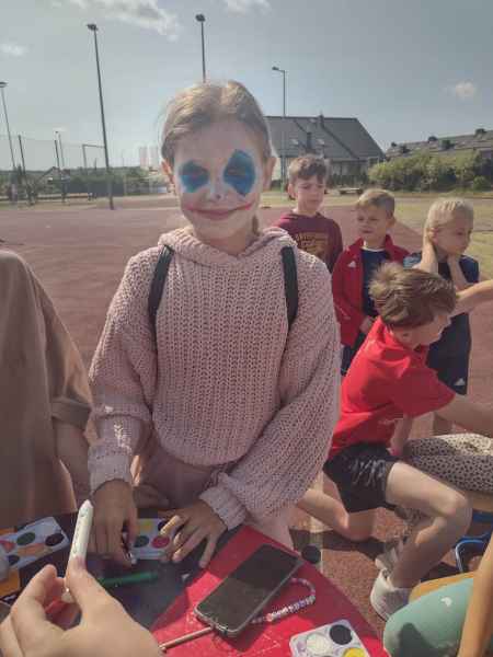 Uczniowie klasy IV f przygotowali stoisko do malowania twarzy, które cieszyło się szczególnym zainteresowaniem. Odwiedzili nas też rycerze, którzy uczyli walki na miecze, był też wspólny taniec – belgijka. Młodzież z klasy V e odpowiedzialna była za stoiska z poczęstunkiem, który został przygotowany przez rodziców z każdej klasy. Na uwagę zasługuje ogromne zaangażowanie rodziców, którzy przygotowali zdrowe, owocowo – warzywne przekąski. Całość uświetnił nam zespól muzyczny „H2” oraz chórek z klasy IV g.