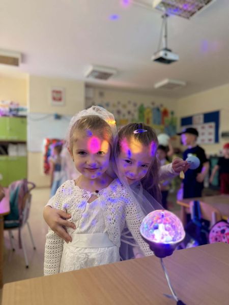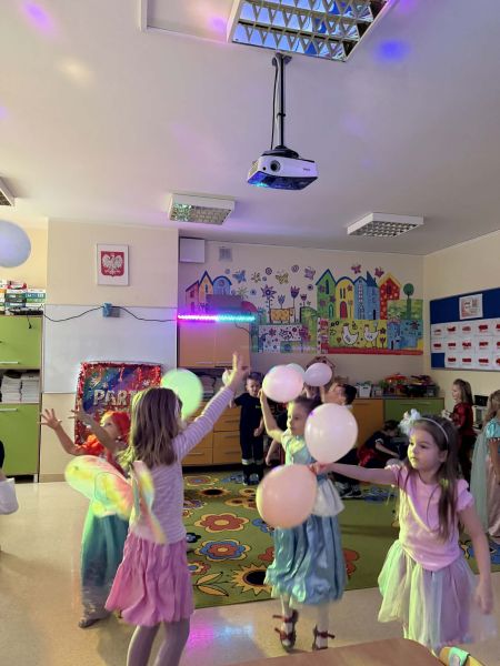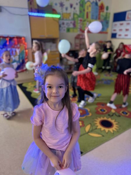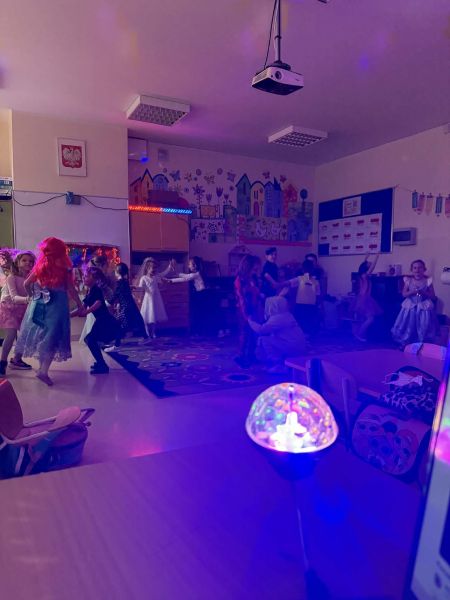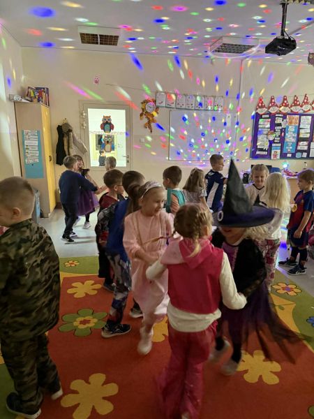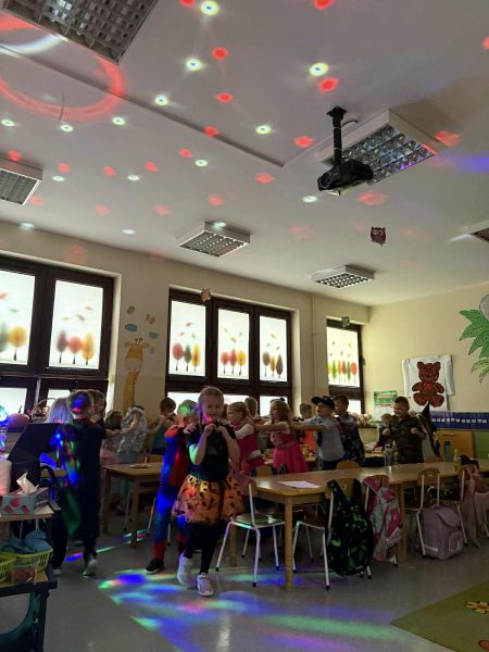 Dzieci z grup 0a i 0b świetnie bawiły się podczas tańców, zabaw ruchowych i animacji, które wypełniły salę śmiechem i energią. Wspólne pląsy, zabawy integracyjne i taneczne konkurencje sprawiły, że każdy znalazł coś dla siebie.