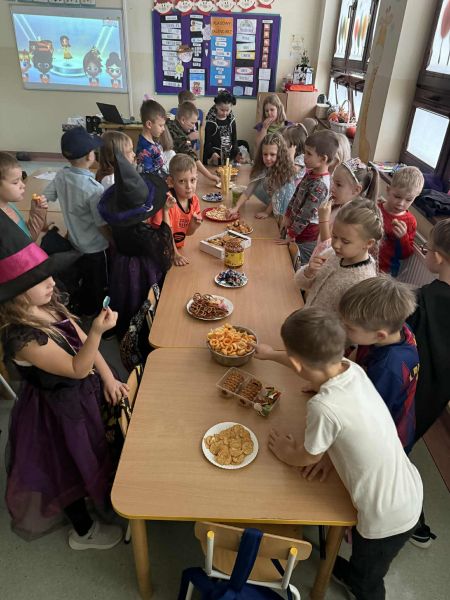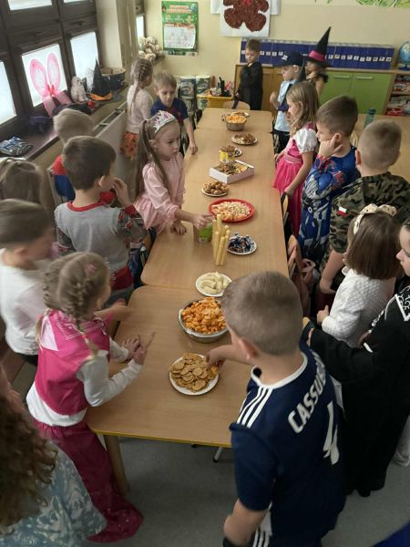 Po intensywnej zabawie przyszedł czas na wspólny poczęstunek, który pozwolił wszystkim odpocząć i spędzić miłe chwile przy stole.