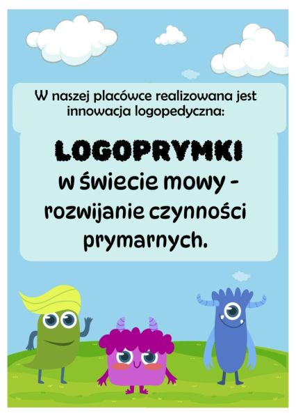 W bieżącym roku szkolnym w naszej szkole realizowana jest także innowacja logopedyczna „Logoprymki w świecie mowy” adresowana do grup przedszkolnych. Celem programu jest usprawnienie artykulacji oraz podstawowych czynności, które są fundamentem mowy: oddychania, połykania oraz gryzienia i żucia.