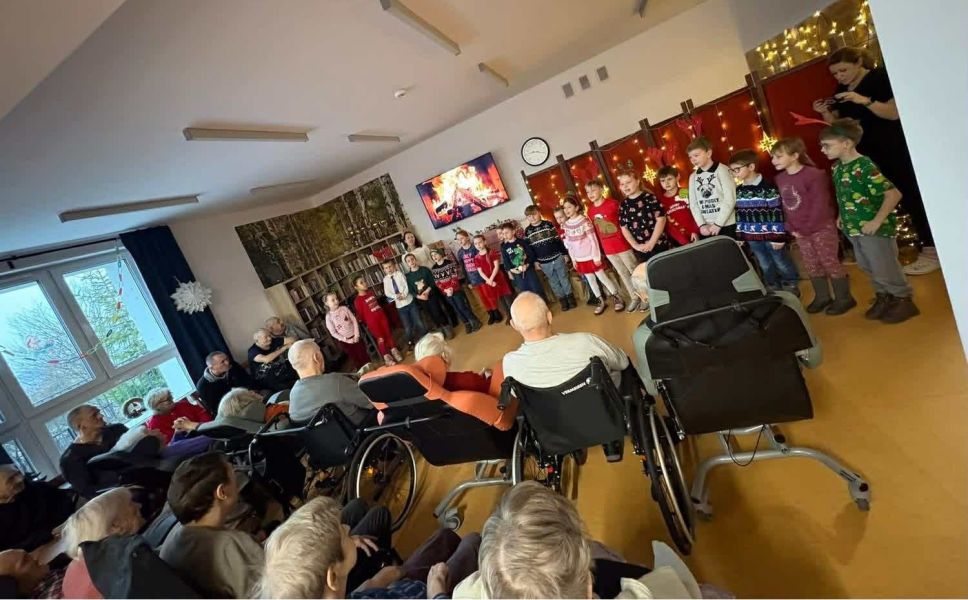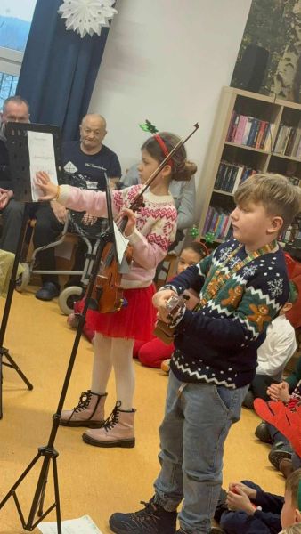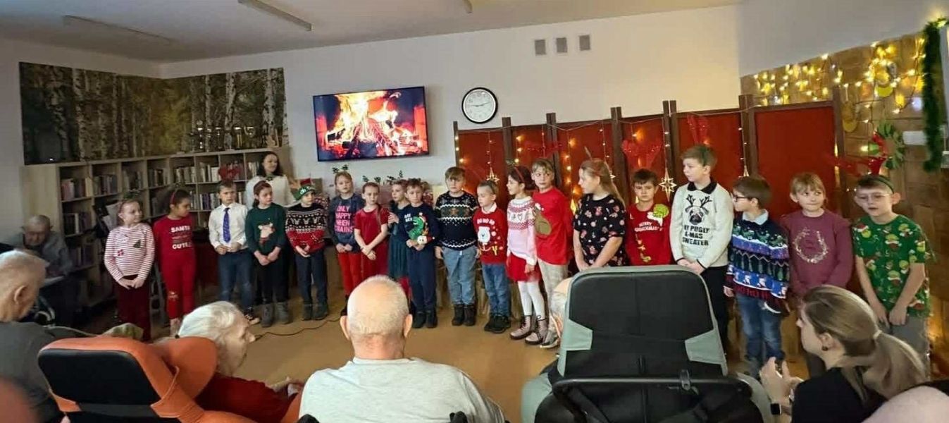 Prezenty dla Mieszkańców DPS zawiozły małe Elfiki z klasy 2A. Swoją wizytę zaczęły od pięknie wykonanego programu artystycznego obejmującego wiersze, pastorałki i kolędy. Te ostatnie - wspólnie śpiewali wszyscy uczestnicy tego wzruszającego spotkania. Na koniec występów, swój talent artystyczny, grą na skrzypcach, zaprezentowała Zuzanna Kowalewska oraz Nikodem Bendyk grający na ukulele. Nie ukrywamy, że chwile te były wyjątkowe i poruszyły niejedno serce, a w wielu oczach pojawiły się łzy wzruszenia.