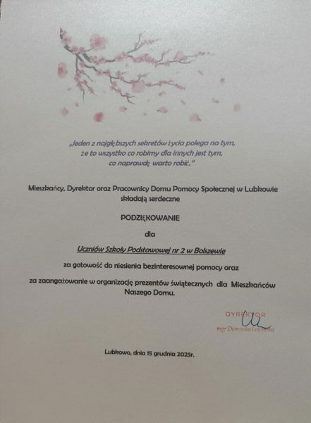 Społeczność Szkoły Podstawowej nr 2 w Bolszewie, w tym roku, włączyła się do akcji zbierania darów i prezentów świątecznych dla Mieszkańców Domu Pomocy Społecznej w Lubkowie. Dzięki wrażliwym sercom Rodziców, Uczniów i Pracowników naszej szkoły udało się zebrać kilka kartonów darów.