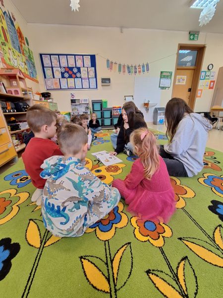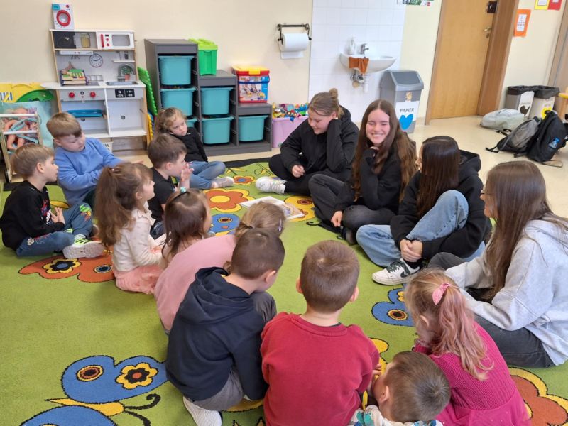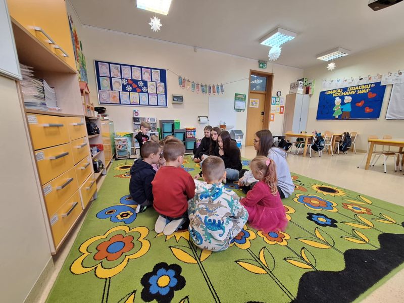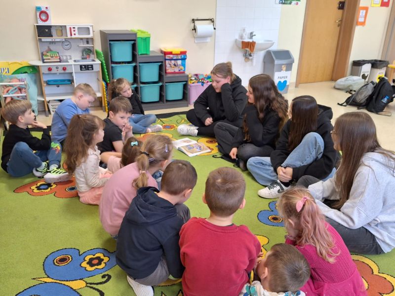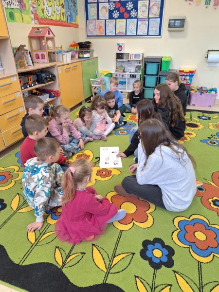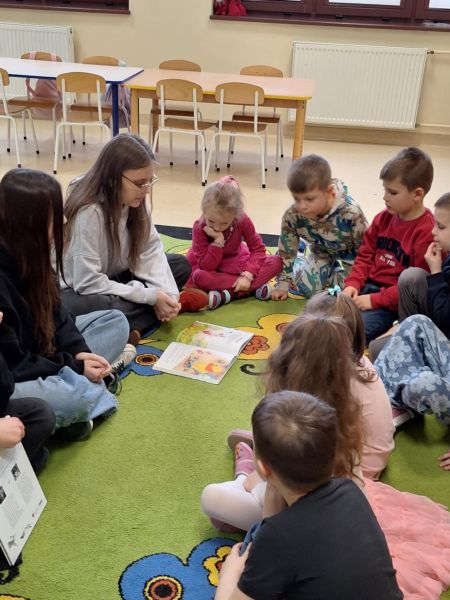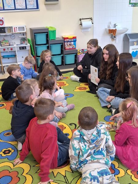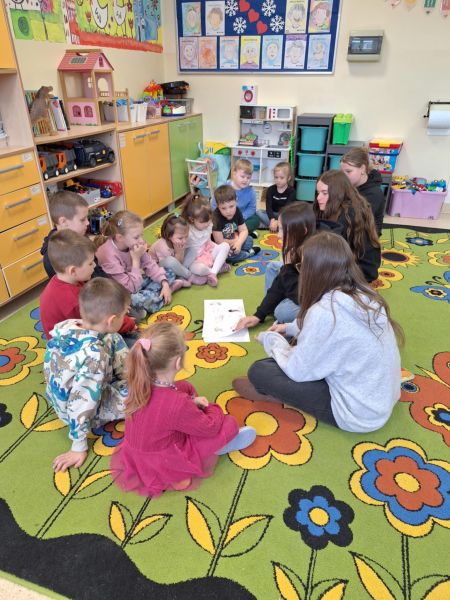 W klasie 0c odbyły się zajęcia czytelnicze. Odwiedziły nas uczennice z klasy 8f. Dziewczyny czytały dzieciom bajki. Dzieci uważnie słuchały i odpowiadały na pytania dotyczące treści. Zajęcia były bardzo interesujące i rozwijające przy okazji tworząc integracje między przedszkolakami, a uczennicami. Serdecznie dziękuję Julii, Wiktorii, Magdzie oraz Mai za ciekawe zajęcia oraz poświęcony czas. Podziękowanie również kierujemy do wychowawcy klasy.