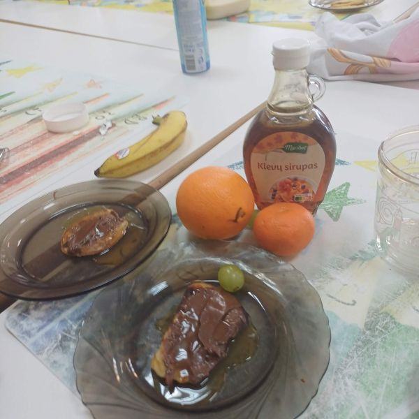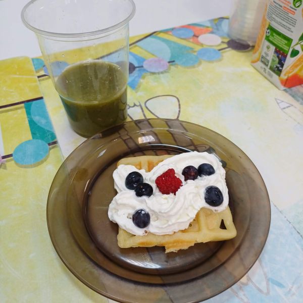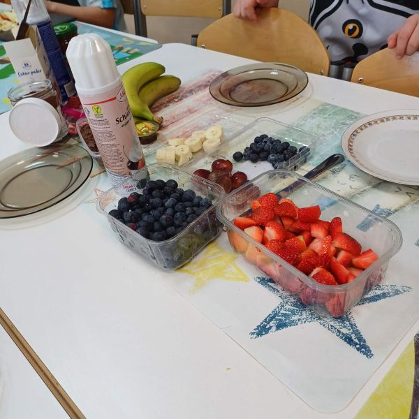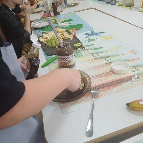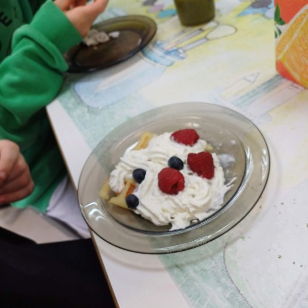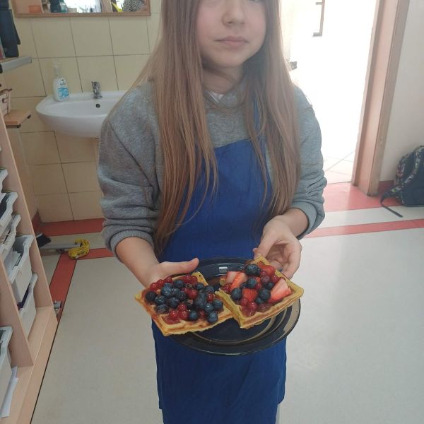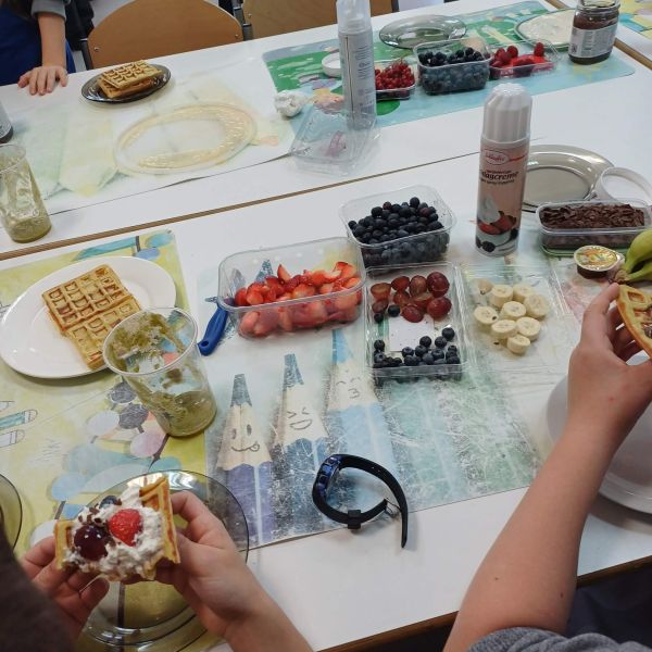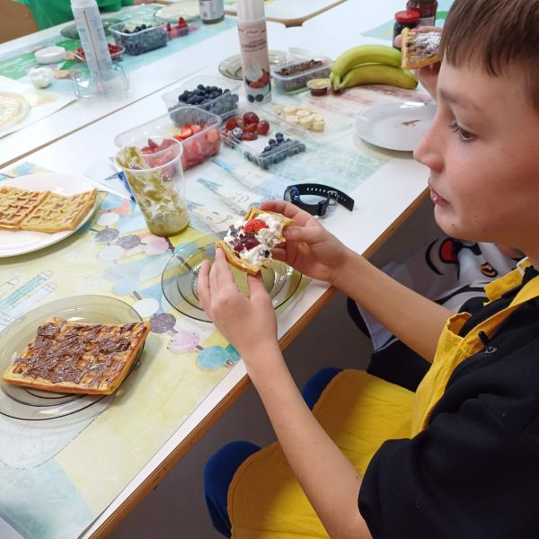 Pierwsze pancakes przysmażyły się trochę za bardzo, ale dzieci zgodnie stwierdziły, że to nic strasznego i pracowały dalej z wielkim zaangażowaniem. Niektórzy uczniowie przygotowali w domu koktajle z owoców i warzyw dla swojej grupy do degustacji. Gofry z bitą śmietaną, syropem lipowym i owocami smakowały wszystkim wyśmienicie.