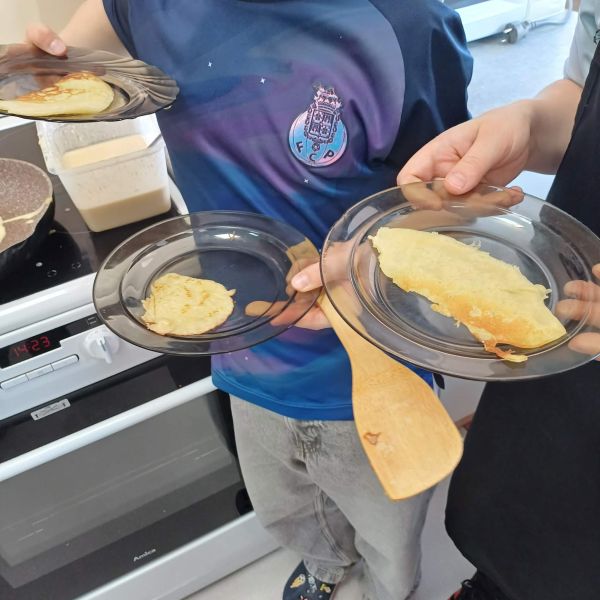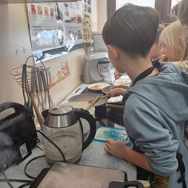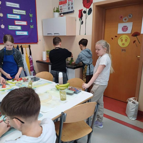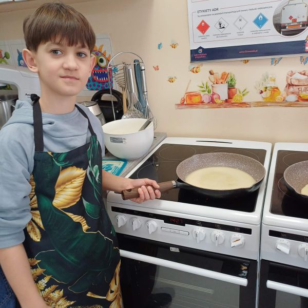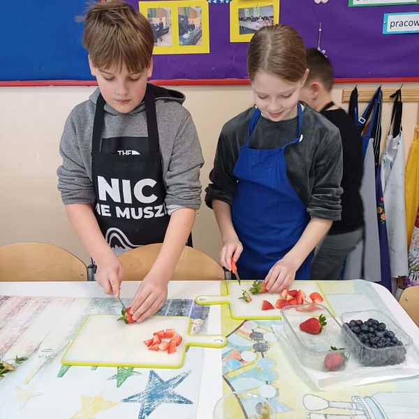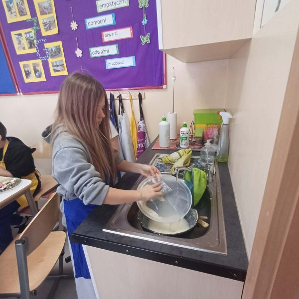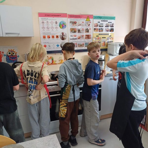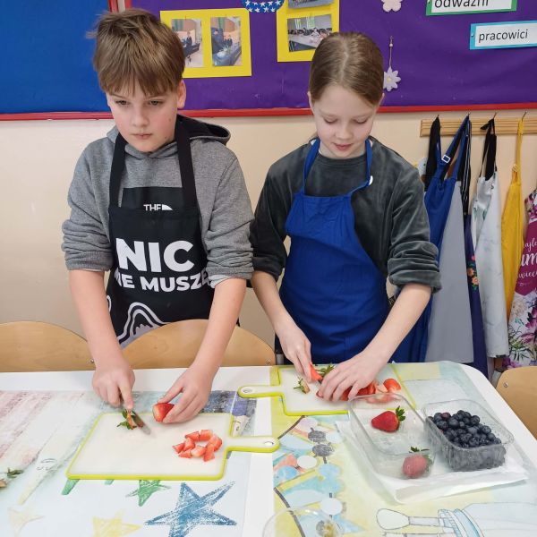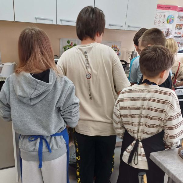 Uczniowie podzielili się swoimi pysznymi wypiekami również z nauczycielami, którzy z podziwem obserwowali ich zdolności kulinarne. Zajęcia w pracowni kulinarnej to nie tylko nauka gotowania, ale także nauka współpracy, odpowiedzialności oraz dbania o porządek – od przygotowania stanowiska pracy, przez podanie potraw, aż po wspólne sprzątanie po zakończonym zadaniu.