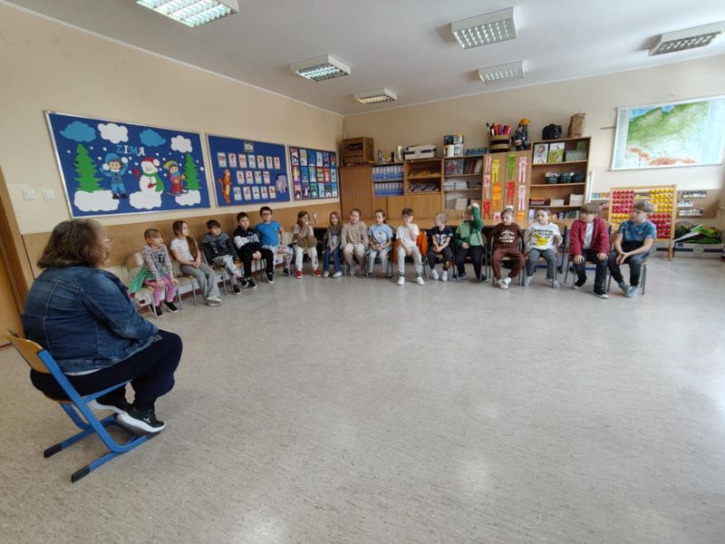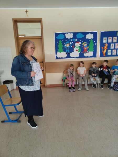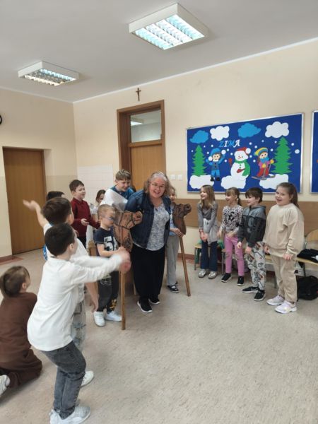 W piątek, 21 lutego naszą klasę odwiedziła pani Maja Falkiewicz, mama Kuby, która od wielu lat uczy w naszej szkole. Pani Maja uczy religii, historii, jest też nauczycielem wspomagającym, opiekunką Koła Teatralnego "Kwadrat" i prowadzi zajęcia rozwijające kompetencje emocjonalno - społeczne. Podczas spotkania opowiedziała o swojej pracy w szkole, a szczególnie o teatrze oraz historii starożytnego Rzymu.