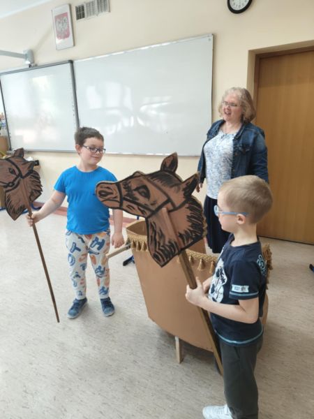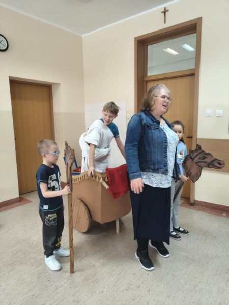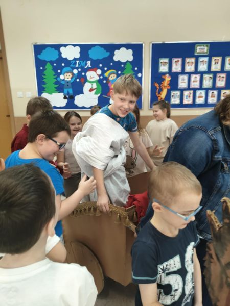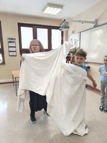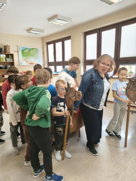 W drugiej części naszego spotkania mogliśmy poczuć się jak podczas rzymskiego triumfalnego przemarszu zwycięskiego wodza, którym został Nikodem, symboliczną togę pomagała mu ubrać Hania, a wierzchowce zaprzężone do rydwanu odegrali Marysia i Jakub, podczas gdy reszta klasy była wiwatującym tłumem Rzymian. Wysłuchaliśmy też historii o braciach Romulusie i Remisie, dzięki którym powstało miasto Rzym.