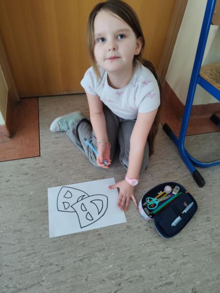 Mogliśmy posilić się winogronami, bo przecież Dionizos, to grecki bóg winnej latorośli, jest również tym ku czci którego, starożytni Grecy tworzyli pierwsze przedstawienia. Obejrzeliśmy krótki materiał o początkach teatru w starożytności, a potem kolorowaliśmy maski teatralne.