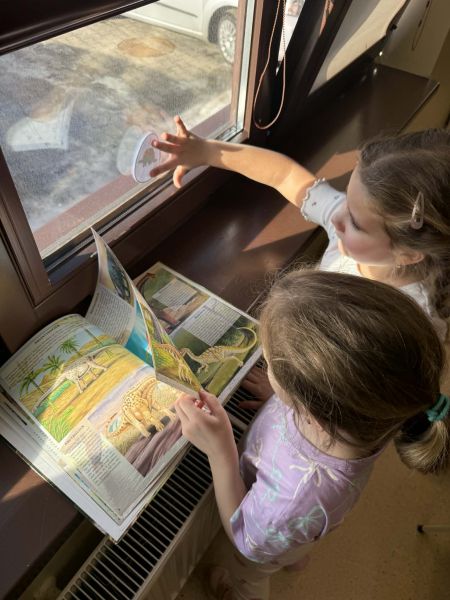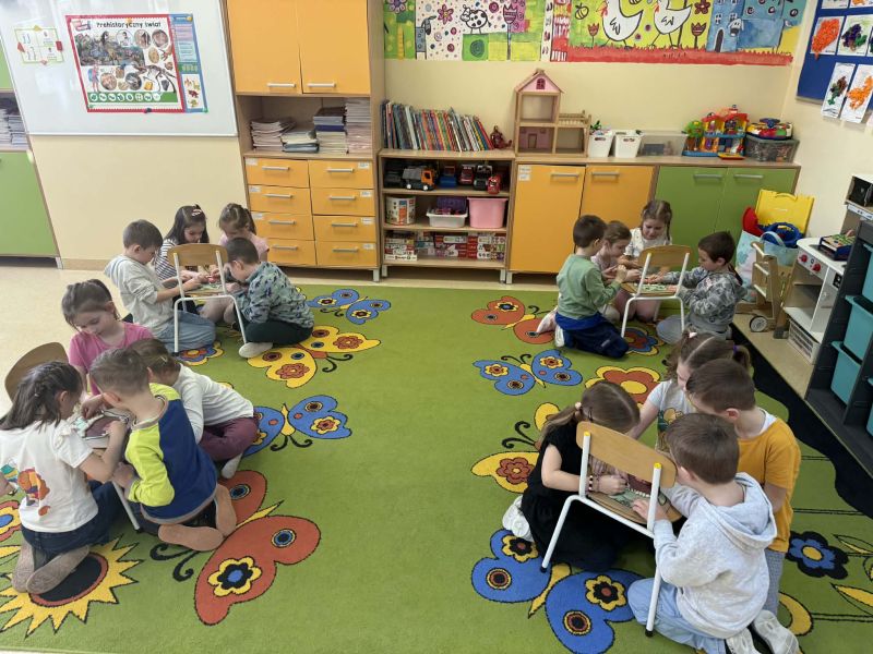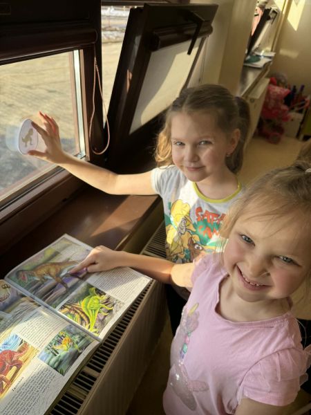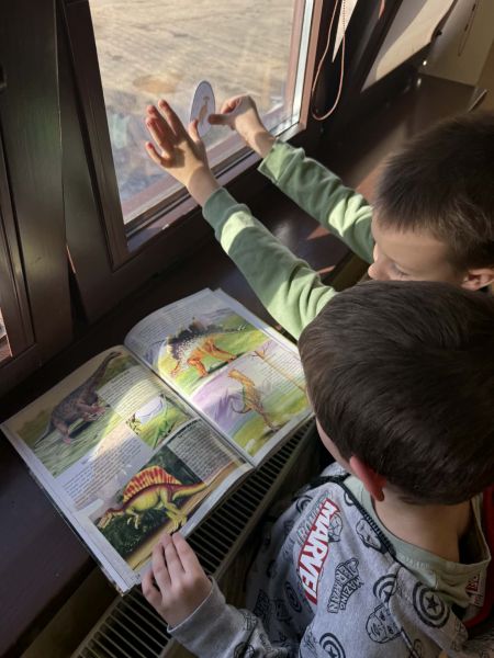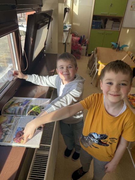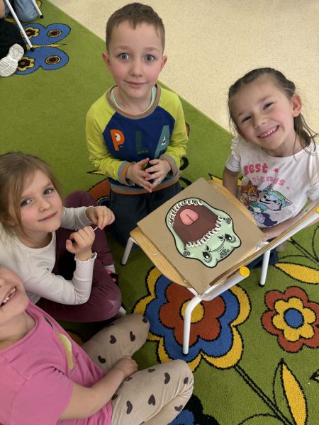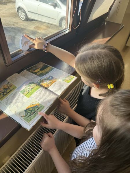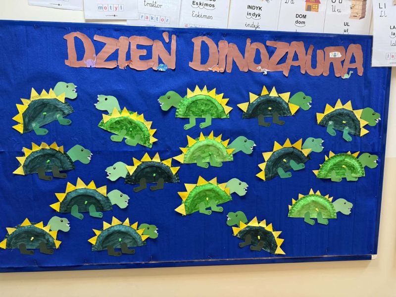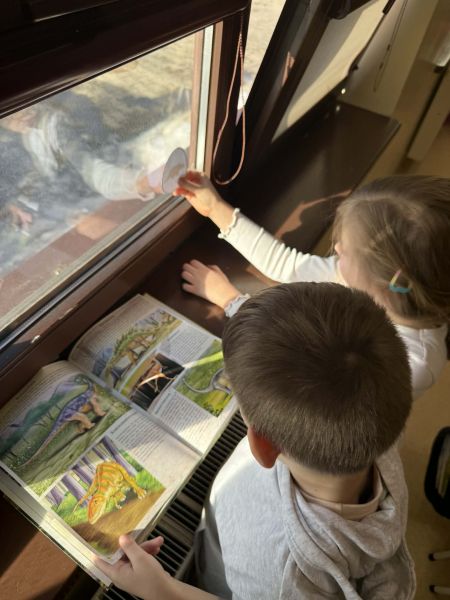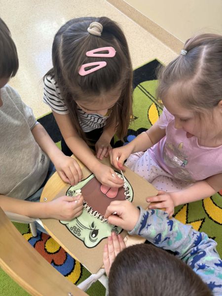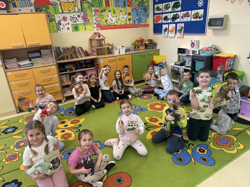 Dziś przenieśliśmy się miliony lat wstecz do świata dinozaurów! Dzieci z zapałem odgadywały, jaki to dinozaur, wyszukiwały ciekawostki i ilustracje w książkach oraz pracowały zespołowo przy specjalnych zadaniach – m.in. „czyściliśmy” zęby dinozaurom.