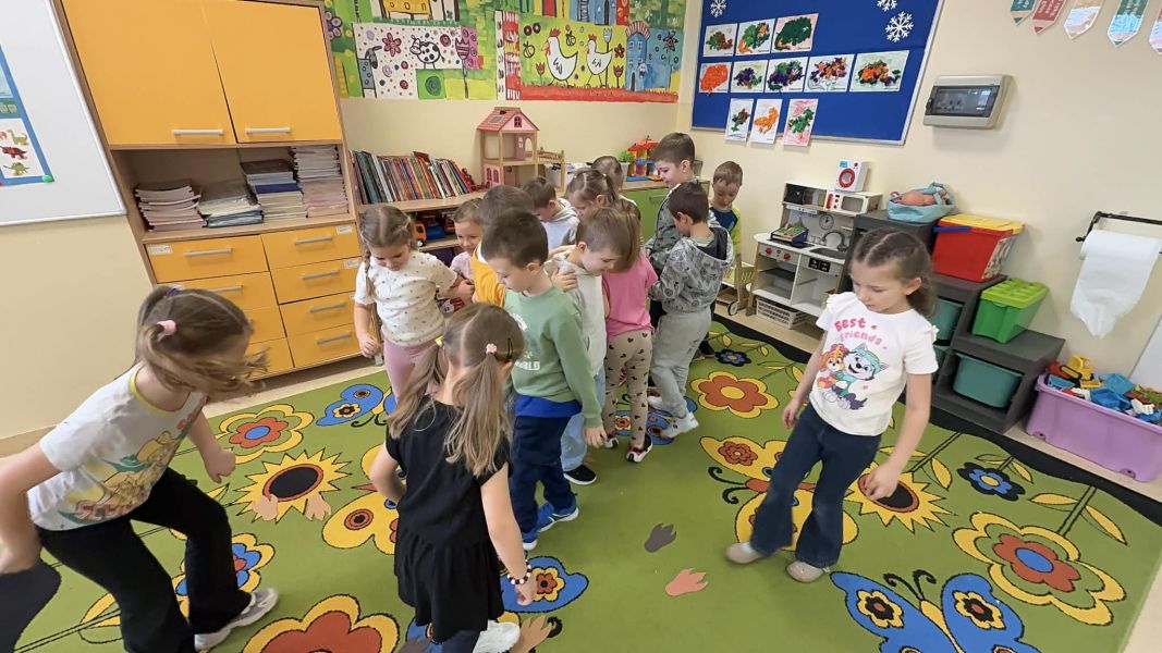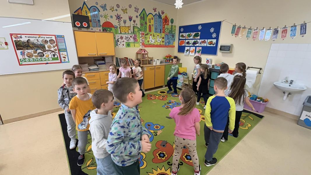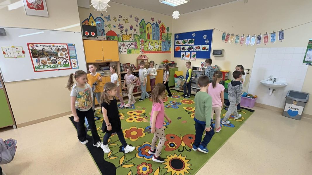 Nie zabrakło także zabaw ruchowych i rytmicznych, podczas których mali odkrywcy poruszali się jak dinozaury, ćwicząc koordynację, refleks i poczucie rytmu.