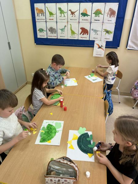Była też nauka piosenek i wierszyków o dinozaurach, twórcza praca plastyczna oraz prezentowanie własnych, zabawkowych dinozaurów.