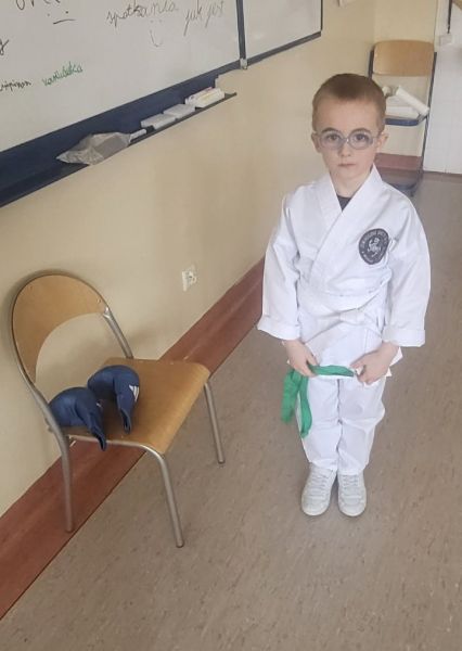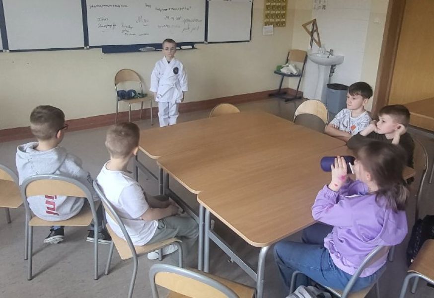 Jakub zaprezentował strój karate,opowiedział o swoich osiągnięciach. Przekazał grupie również kilka podstawowych zwrotów używanych podczas treningów, pokazał, w jaki sposób należy się przywitać na macie oraz zademonstrował proste ćwiczenia, które uczniowie z dużym zaangażowaniem naśladowali.