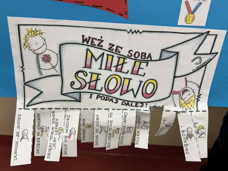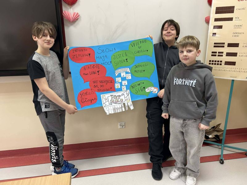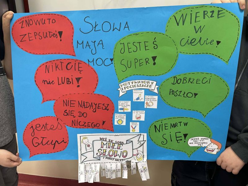 Obserwacje z zajęć sportowych zostały wykorzystane podczas lekcji z wychowawcą. Uczniowie stworzyli plakaty, na których podzielili słowa na te, które budują, i te, które ranią.