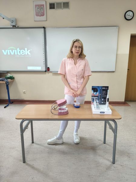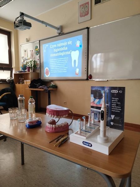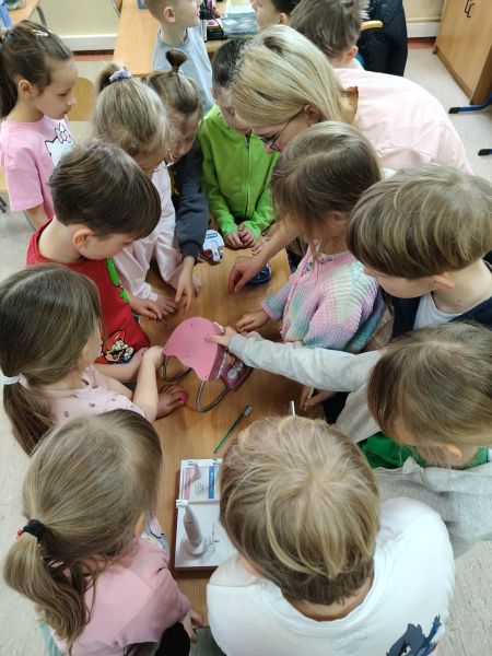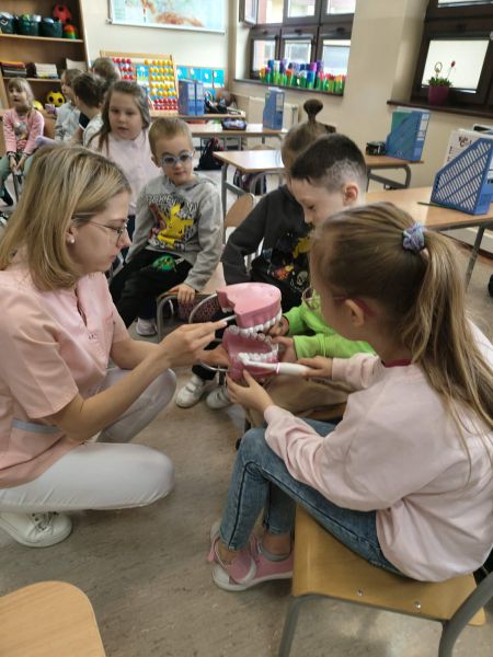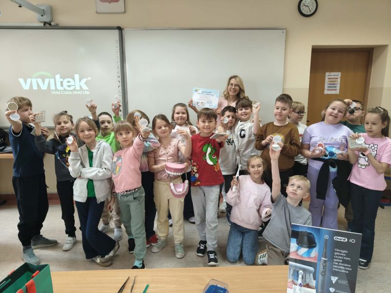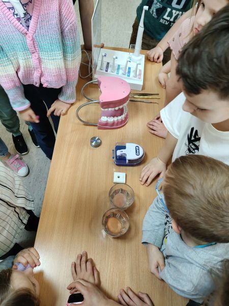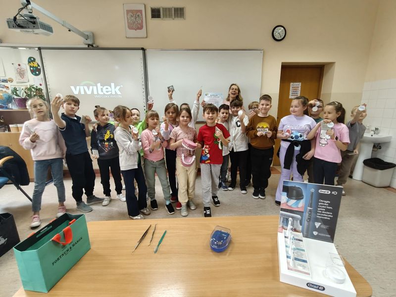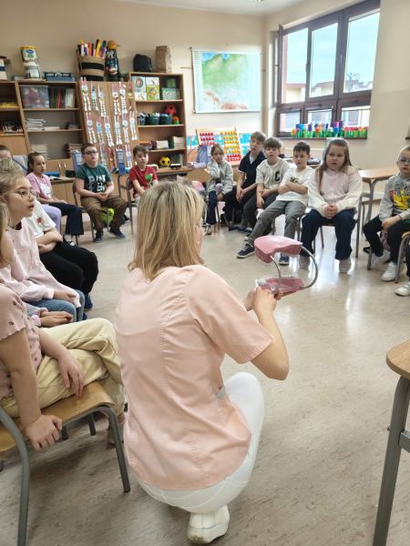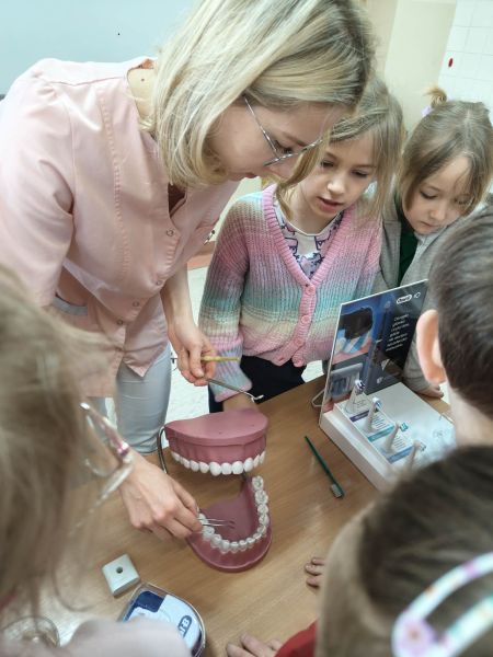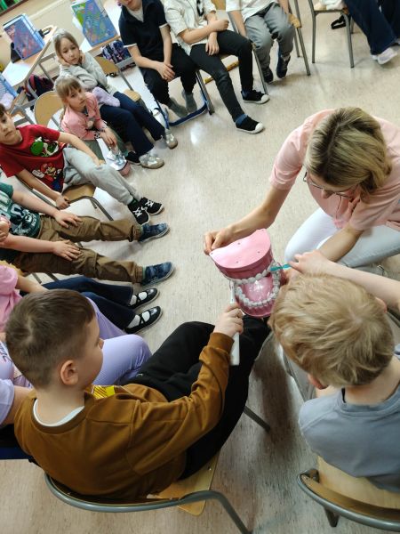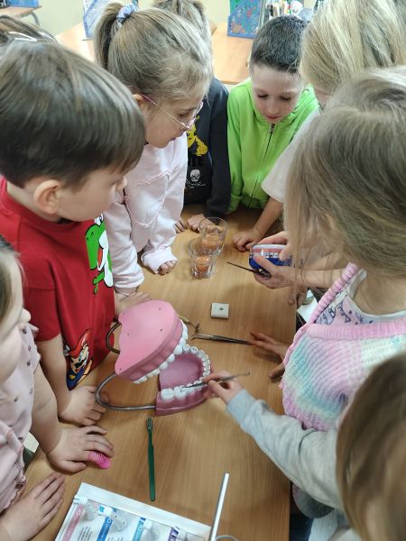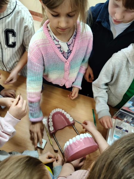 19 marca klasę 2C odwiedziła Pani Wiktoria – ciocia jednego z uczniów, która na co dzień pracuje jako asystentka stomatologiczna w Dentostacji w Bolszewie. Podczas spotkania zaprezentowała najciekawsze aspekty swojej pracy oraz w przystępny sposób opowiedziała dzieciom o budowie i znaczeniu dbania o zęby. Uczniowie mieli okazję zobaczyć profesjonalny sprzęt stomatologiczny, a także wziąć udział w praktycznym instruktażu prawidłowego mycia zębów.